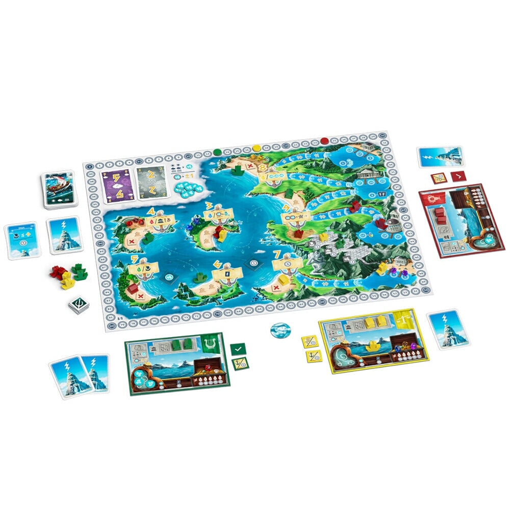 - Inhalt52 Segelkarten, 28 Plättchen „Eine Brise Wind“, 21 Kristalle, 20 Aktionskarten Gunst der Götter“, 20 Schiffe, 12 Siedlungen, 10 Hafenplättchen, 7 Plättchen „Poseidon“, 4 Abdeckplättchen, 4 Bonusplättchen „Extra-Aktion“ und „Kartentausch“, 4 doppelseitiges Spielertableaus, 4 Figuren „Prophet“, 4 Siegpunktemarker, 1 doppelseitiger Spielplan, 1 Plättchen „Aeolos“, 1 Spielanleitung