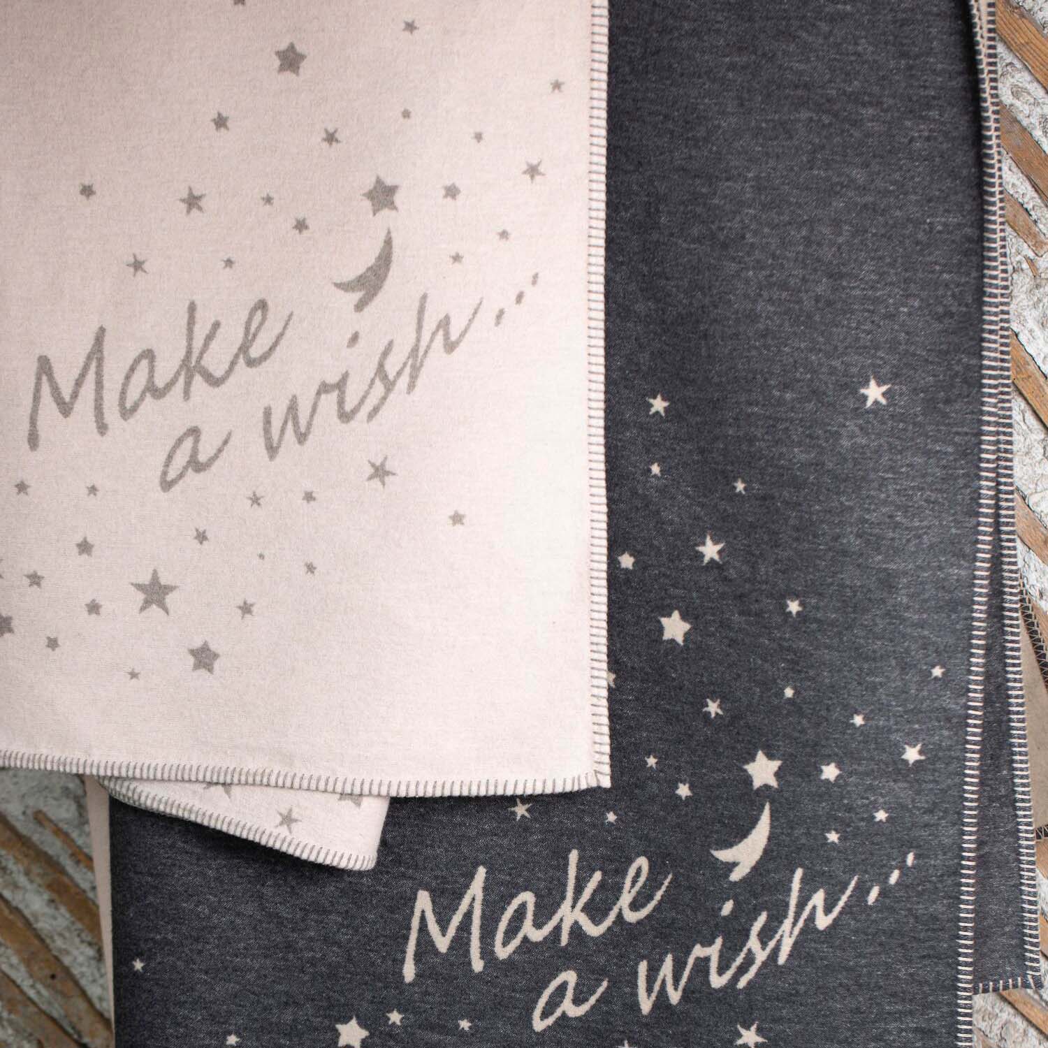 Wünsch dir was! Die wundervolle Decke "Sylt - make a wish" von David Fussenegger lädt zum Träumen ein. Zahlreiche Sterne und ein geschwungener Schriftzug entführen uns ins Land der Wünsche und sorgen für ein gemütliches Wohngefühl. Wunderbar weich und mit einem edlen umlaufenden Zierstich lädt sie zum Kuscheln und Verweilen ein und wird zum zauberhaft schönen Accessoire im Wohnzimmer, Schlafzimmer oder auf deiner Terrasse. Denn ob im kalten Winter oder in langen Sommernächten beim Sternschnuppenbeobachten - Wünsche wollen in Erfüllung gehen!
