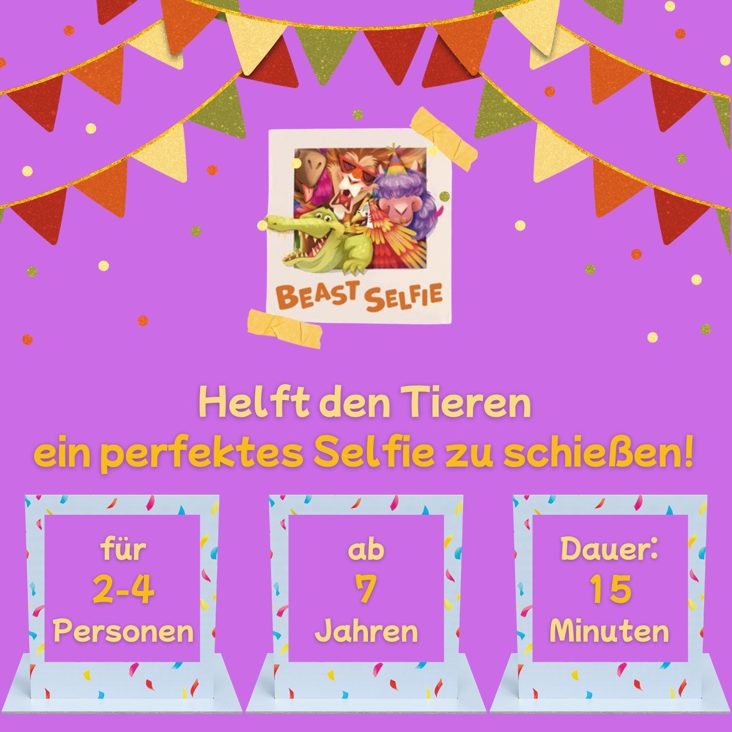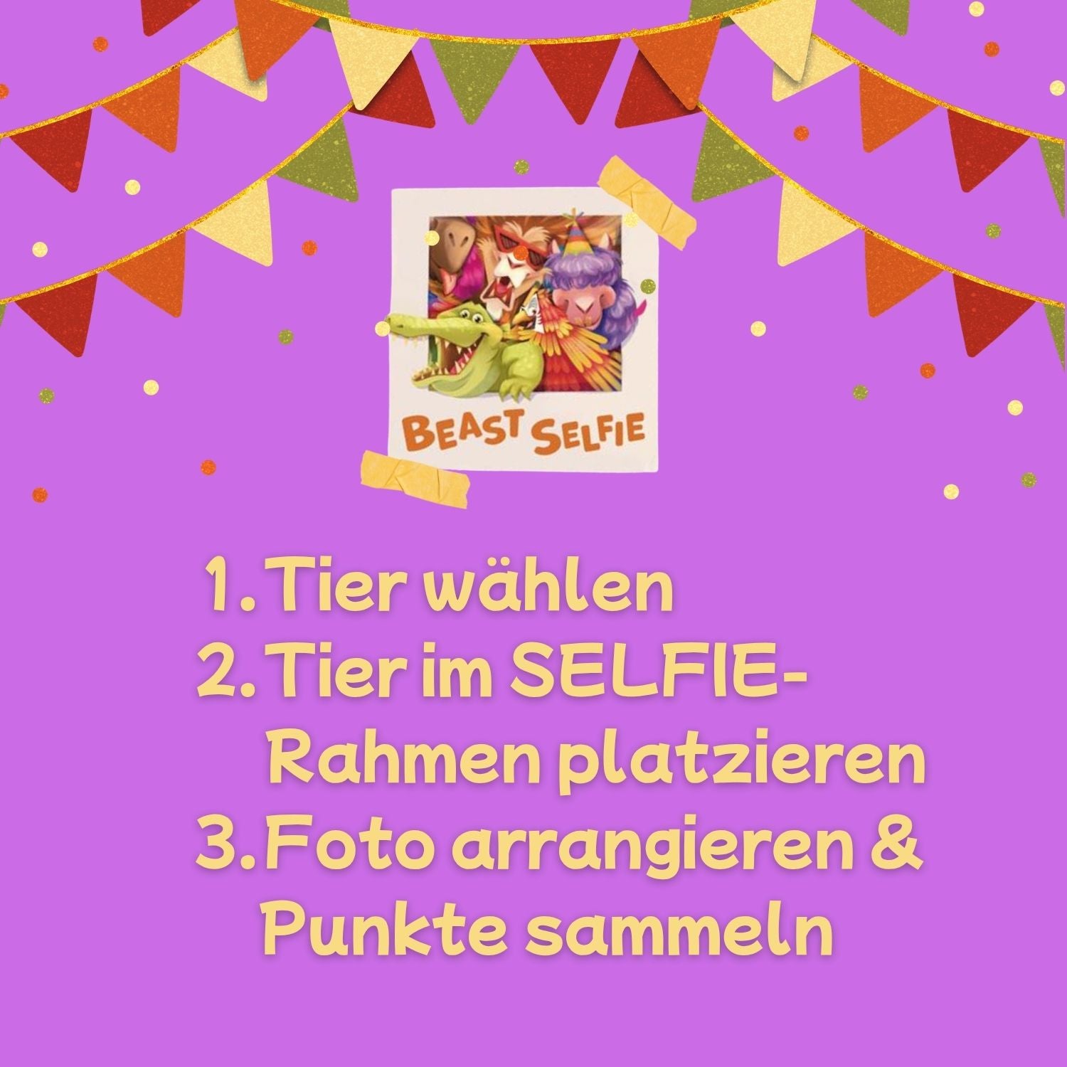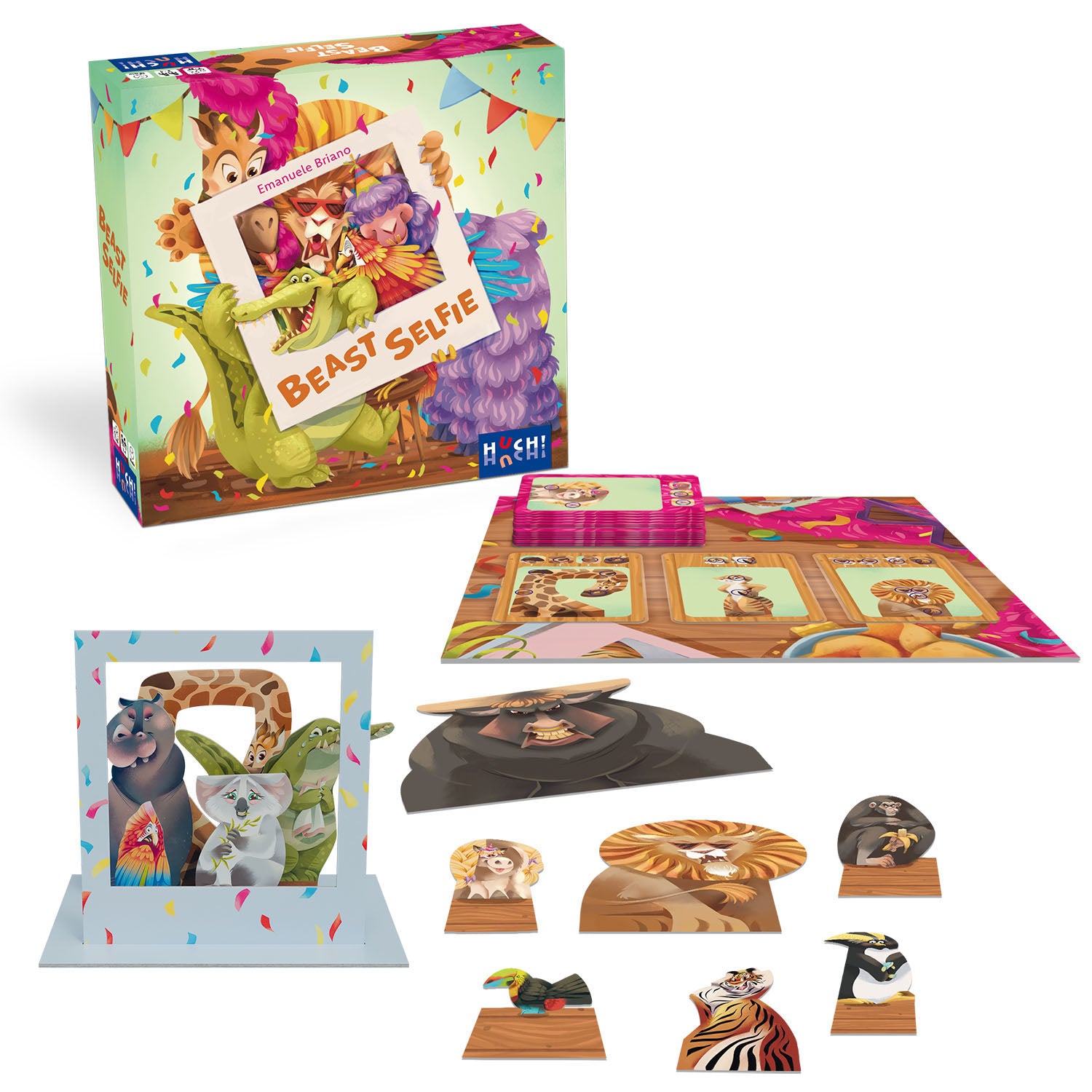 Partytime - Konfetti fliegt, die Wimpel flattern und alle Tiere feiern mit. Was nicht fehlen darf? Natürlich Erinnerungsfotos: Helft den Tieren dabei, ein perfektes BEAST SELFIE zu schießen! Reihum wählt ihr pro Runde ein Tier aus und platziert es in einer freien Reihe (mit der Rückseite zu euch) in eurem Selfie-Rahmen. Leider ist der Platz begrenzt und Pinguin, Krokodil & Co wollen jeweils ihre Schokoladenseiten zeigen. Sind alle 5 Reihen besetzt, dreht ihr den Selfie-Rahmen um und macht echte Schnappschüsse mit einer Kamera. Für jedes komplett sichtbare Lieblingsmerkmal eines Tieres bekommt ihr Punkte!