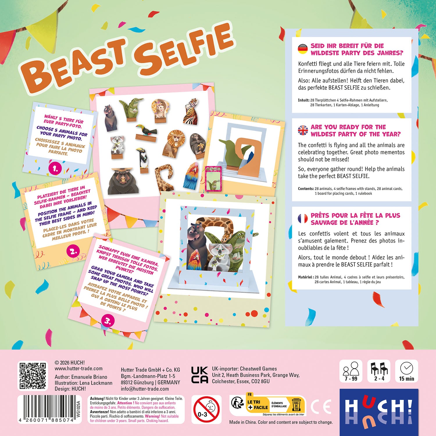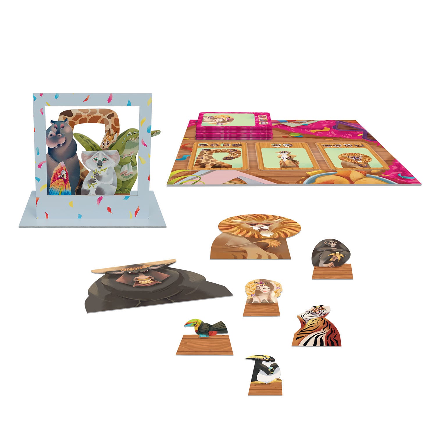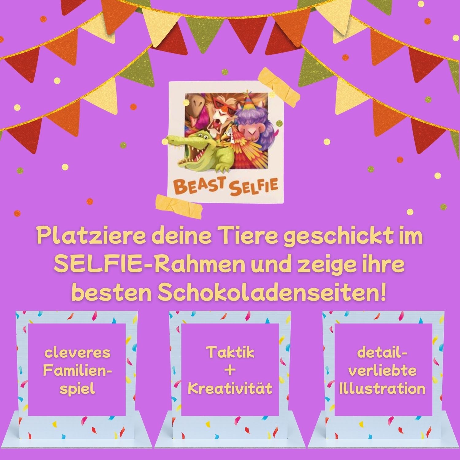 Partytime - Konfetti fliegt, die Wimpel flattern und alle Tiere feiern mit. Was nicht fehlen darf? Natürlich Erinnerungsfotos: Helft den Tieren dabei, ein perfektes BEAST SELFIE zu schießen! Reihum wählt ihr pro Runde ein Tier aus und platziert es in einer freien Reihe (mit der Rückseite zu euch) in eurem Selfie-Rahmen. Leider ist der Platz begrenzt und Pinguin, Krokodil & Co wollen jeweils ihre Schokoladenseiten zeigen. Sind alle 5 Reihen besetzt, dreht ihr den Selfie-Rahmen um und macht echte Schnappschüsse mit einer Kamera. Für jedes komplett sichtbare Lieblingsmerkmal eines Tieres bekommt ihr Punkte!