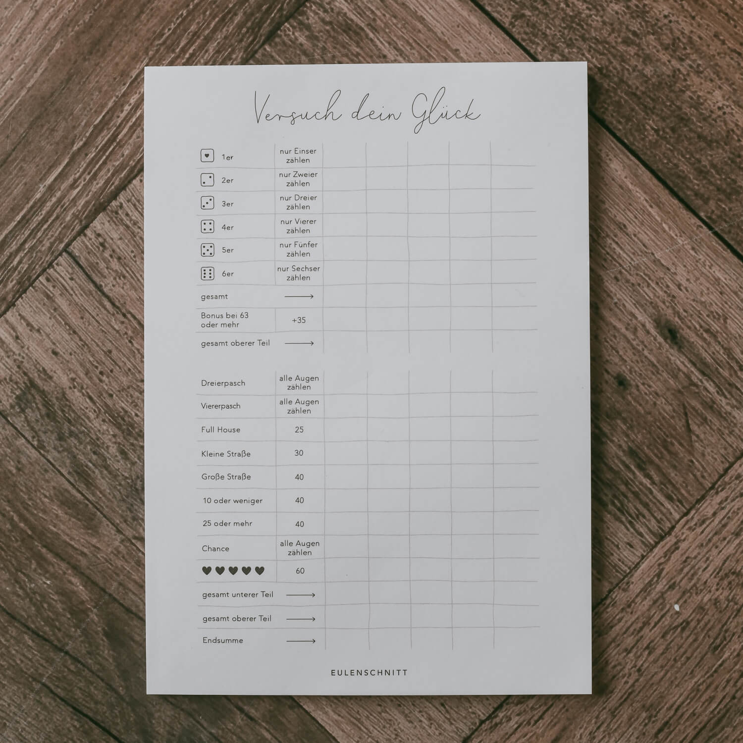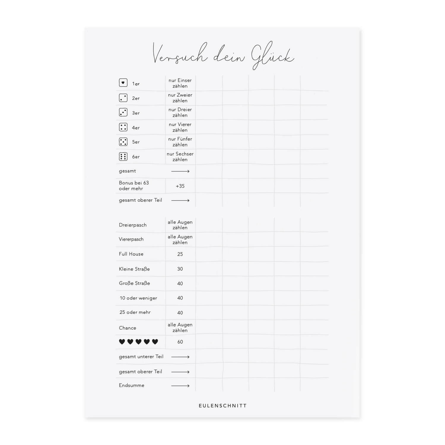 Wage es und versuch dein Glück! Mit dem liebevoll designten Spielblock "Versuch dein Glück" von Eulenschnitt bringst du frischen Wind in deine Spieleabende. Der klassische Kniffel-Charme wurde hier mit einem Hauch von Kreativität und einzigartigem Design neu interpretiert, um dir ein unverwechselbares Spielerlebnis zu bieten.