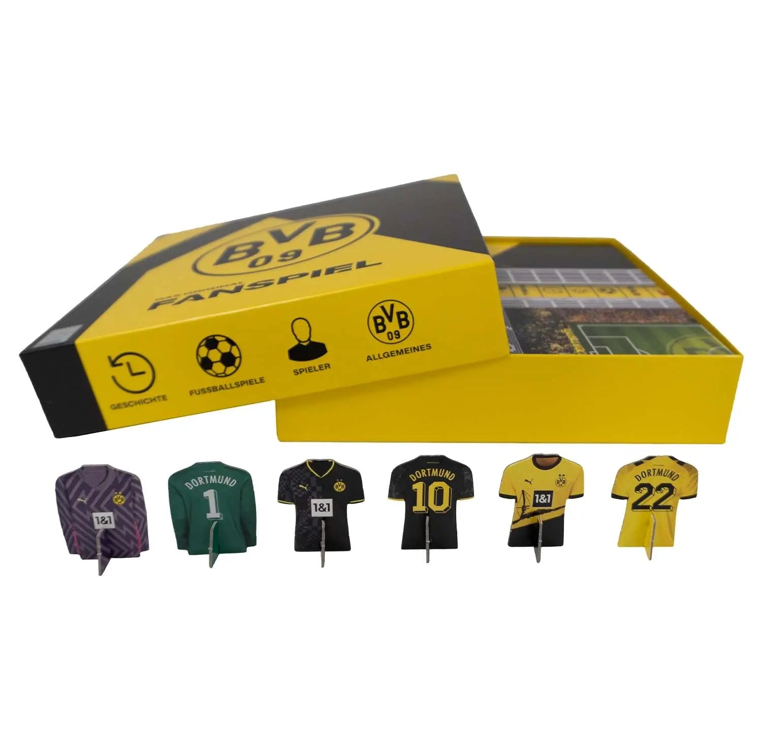 Entdecke das Original Fanspiel – das Brettspiel, das speziell für treue Anhänger von Borussia Dortmund geschaffen wurde! Erlebe eine mitreißende Reise durch die stolze Fußballhistorie des Vereins, bei der du auf frühere und aktuelle Dortmund-Spieler triffst. Mit insgesamt 400 Fragen über den Verein und seine lange und umfangreiche Geschichte kannst du dein Wissen auf die Probe stellen und in die Tiefen eintauchen, und vielleicht lernst du ja sogar noch etwas Neues, was du noch nicht über deinen Herzensverein wusstest. Das Original Fanspiel ist mehr als nur ein Spiel – es ist ein einzigartiges Erlebnis, das Fans verbindet und euch die Liebe zu Borussia Dortmund auf eine ganz besondere Weise teilen lässt. Egal, ob du ein leidenschaftlicher Stadionbesucher oder ein begeisterter Fan bist, dieses Spiel wird dein Wissen über Dortmund auf die Probe stellen und deine Liebe zum Verein vertiefen. Bring deine Freunde und Familie zusammen, fordere sie im Wissensduell heraus, und erlebt gemeinsam mit dem Original Fanspiel unvergessliche Momente. Das Spiel vereint die Leidenschaft zu Borussia Dortmund und Spielfreude zu Hause. Gemeinsam könnt ihr Momente schaffen, die diesen großartigen Verein ehren. Denn wir wissen, Dortmund steht für mehr als nur Fußball – es ist ein Lebensstil, den du jetzt durch dieses Spiel noch intensiver leben kannst. Hol es dir jetzt und erlebe Borussia Dortmund auf eine neue, fesselnde Art!