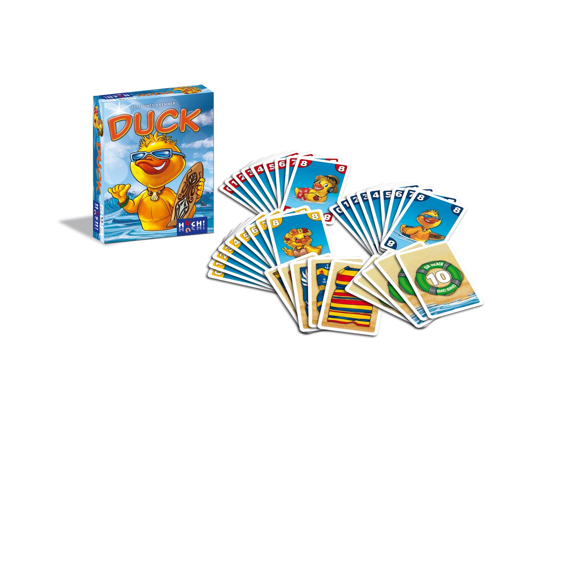 Lulu, Sonny and Duke nehmen am großen Entenrennen teil. Spiele clever deine Handkarten aus und beobachte deine Gegner genau. Wer seine Karten als Erster abgespielt hat, nimmt den Rundensieg mit und kassiert wertvolle Punkte. Sei mutig und kürze durch ein Duck wagemutig ab, aber hast du wirklich die niedrigste Summe auf der Hand? Wer ist am schnellsten Duck und weg und holt sich so die meisten Siegpunkte?