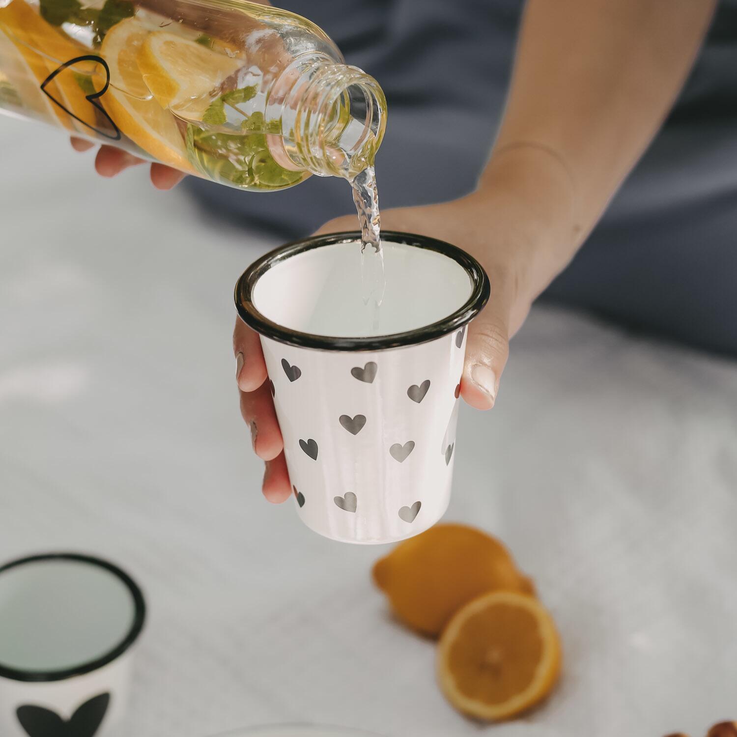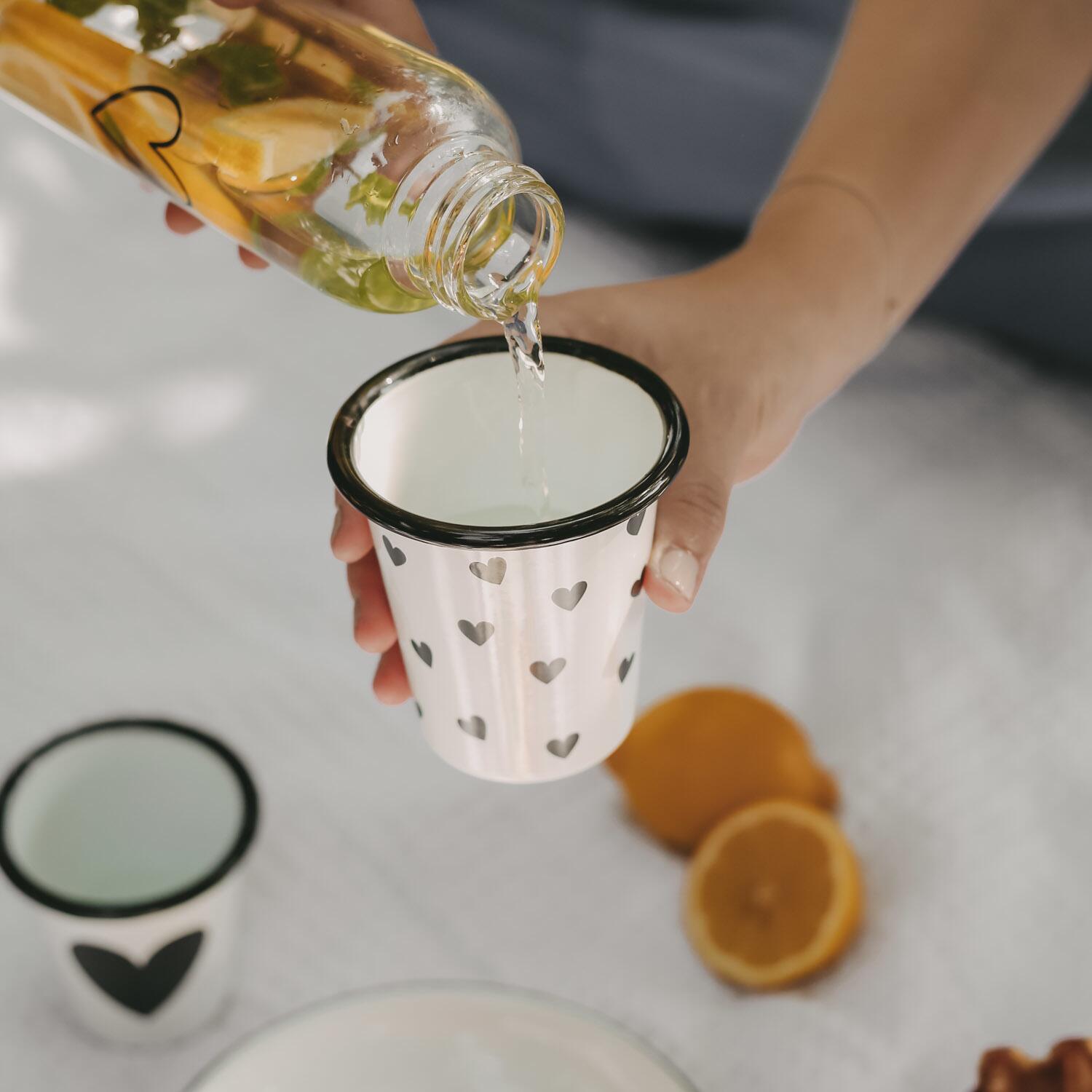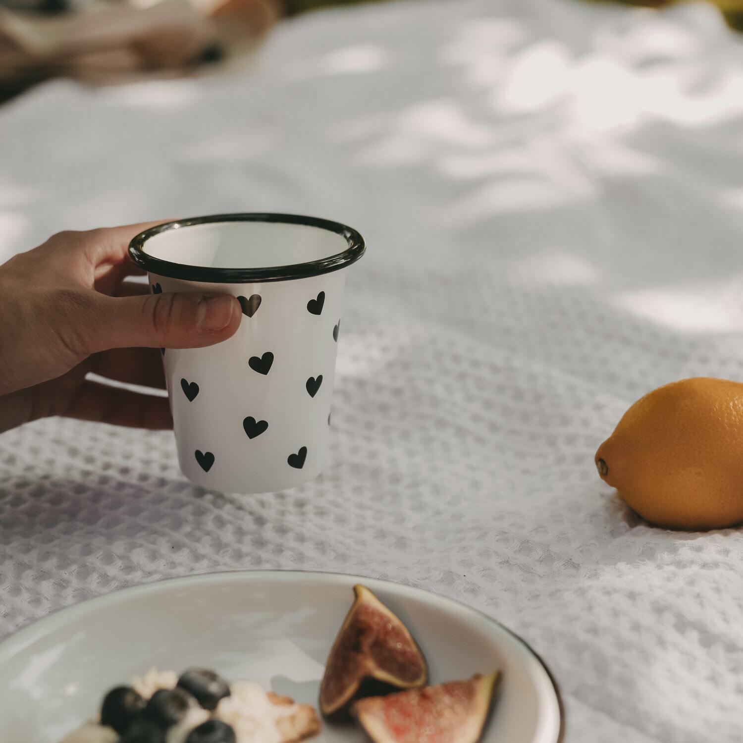 Emaille Becher "Herzen" - 290 ml (Weiß/Schwarz)
