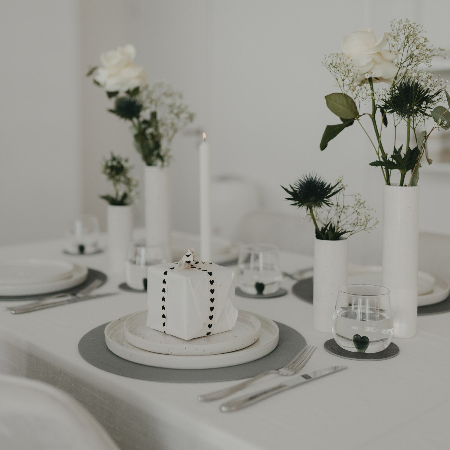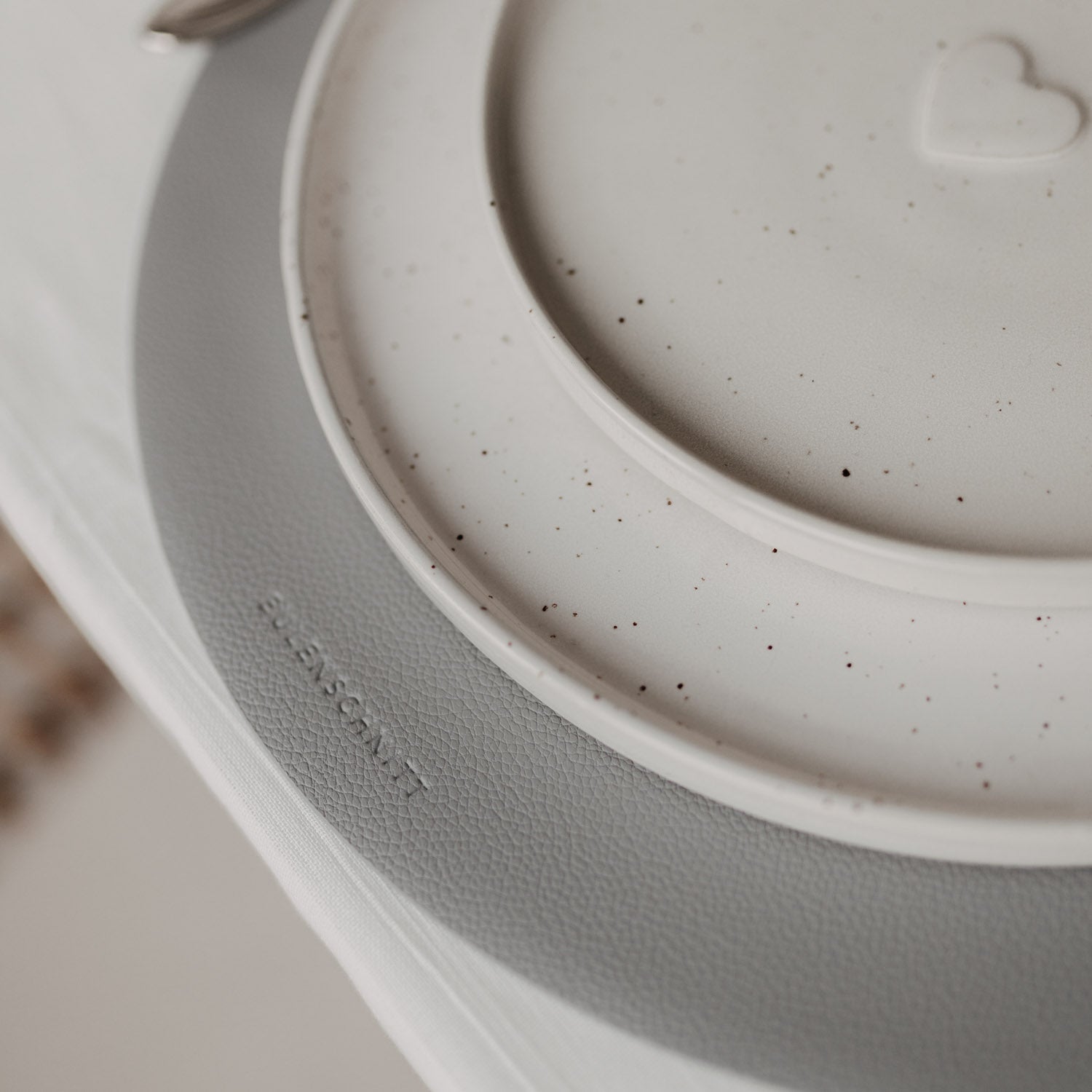 Das wendbare Platzset Herz Grau von Eulenschnitt bringt schlichte Eleganz und vielseitige Dekorationsmöglichkeiten in jedes Zuhause. Ob als klassisches Platzset für Gäste, als stilvoller Blickfang in der Tischmitte, auf dem Sideboard oder als edles Detail auf der Festtagstafel - dieses Platzset überzeugt in jeder Umgebung. Besonders praktisch ist die beidseitige Nutzbarkeit: Eine Seite zeigt sich in einem sanften Grauton, die andere in tiefem Anthrazit. In der Mitte sorgt jeweils ein dezentes Herzmotiv für eine liebevolle Atmosphäre, während auf der hellen Seite zusätzlich der feine Eulenschnitt-Schriftzug am unteren Rand zu finden ist. Mit einem Durchmesser von 35 cm bietet das Platzset ausreichend Fläche, um Teller, Dekoration oder Kerzen stilvoll in Szene zu setzen. Gleichzeitig bleibt es ein zeitloses Accessoire, das sich harmonisch in unterschiedlichste Einrichtungsstile einfügt. Schön, schlicht und flexibel einsetzbar ein echtes Lieblingsstück für den gedeckten Tisch.