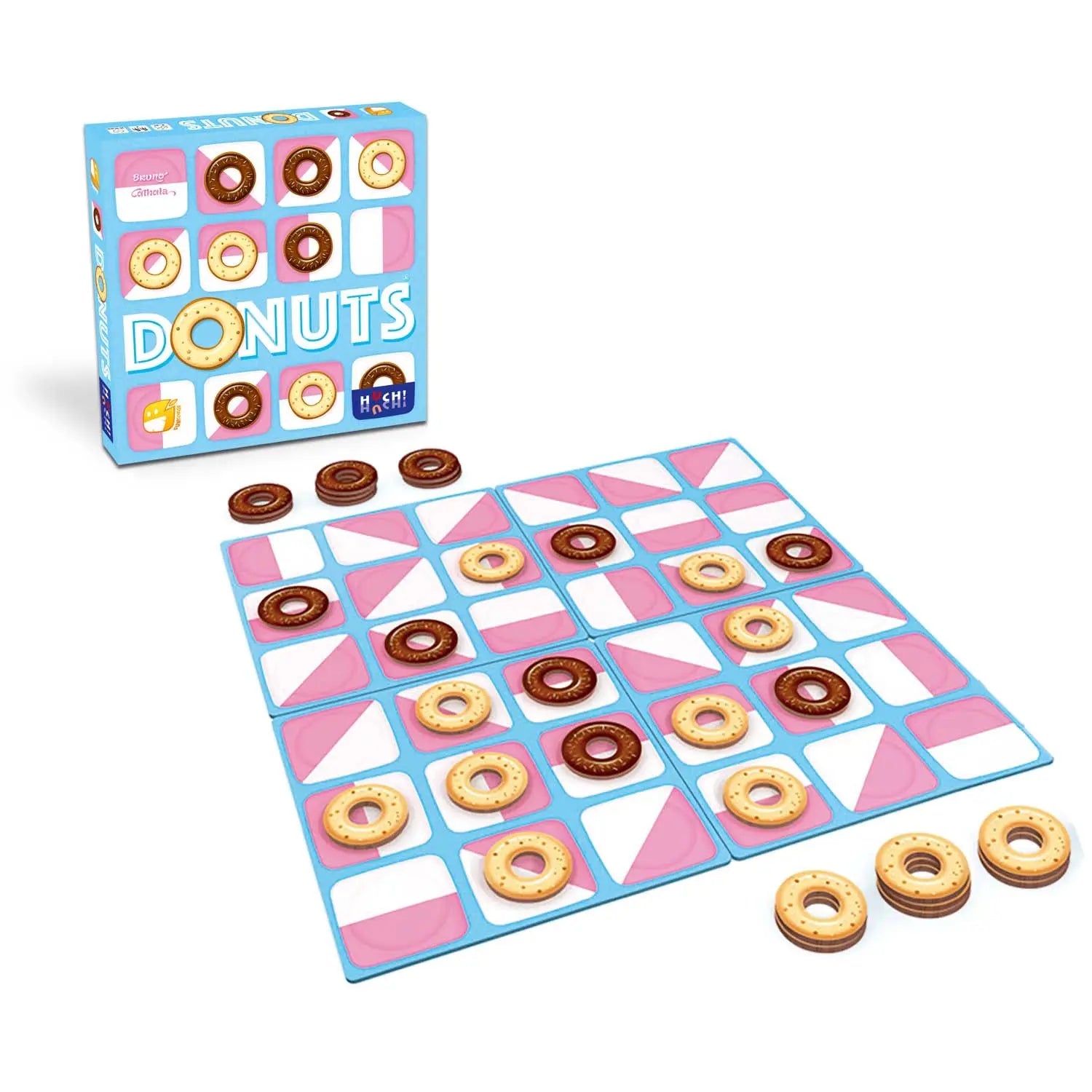 5 eigene Donuts in einer Reihe platzieren. Klingt einfach, ist aber ganz schön herausfordernd. Denn mit jeder Platzierung gibt man dem Kontrahenten vor, wo er einen Donut legen darf. Dabei kann es passieren, dass benachbarte Donuts umgedreht werden und plötzlich die andere Farbe zeigen! Wer es schafft taktisch zu legen, wird dieses süße Spiel gewinnen!
