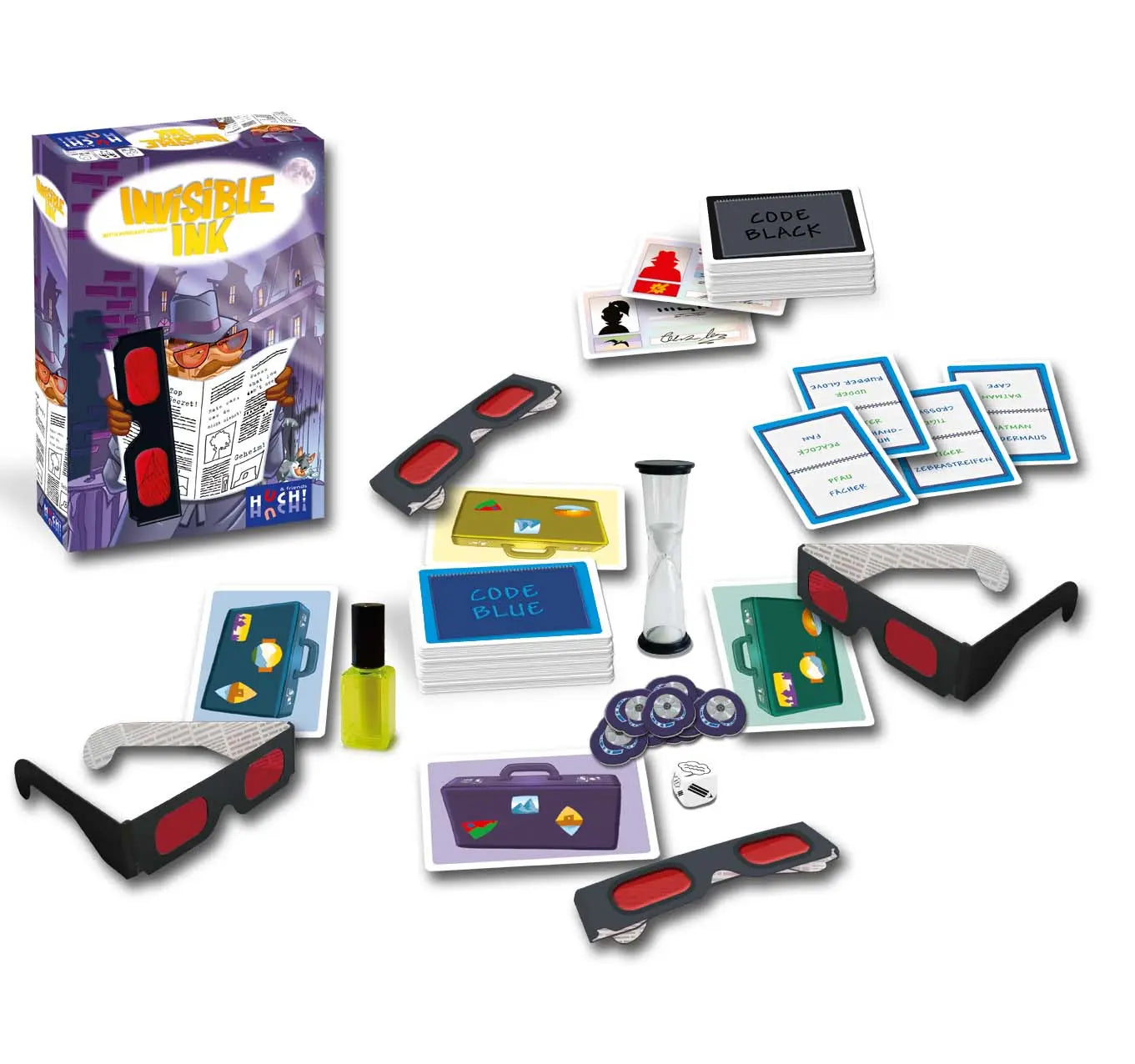 - Inhalt6 rote Brillen, 1 roter Stift, 1 Sanduhr, 1 Würfel, 200 Karten, 60 Punktechips, 1 Anleitung