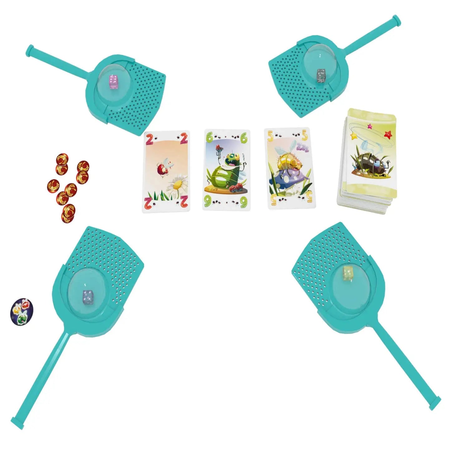 Die Fliegenkarten liegen auf dem Tisch! Das Ziel ist, die größte Sammlung anzulegen, entweder mit Karten gleicher Farbe oder mit einer Reihe von verschiedenen Fliegen. 1, 2, 3: Schlage deine Fliegenklatsche auf die gewünschte Karte. Ein Mitspieler will deine Karte haben? Der Würfel auf deiner Fliegenklatsche entscheidet, wer gewinnt!