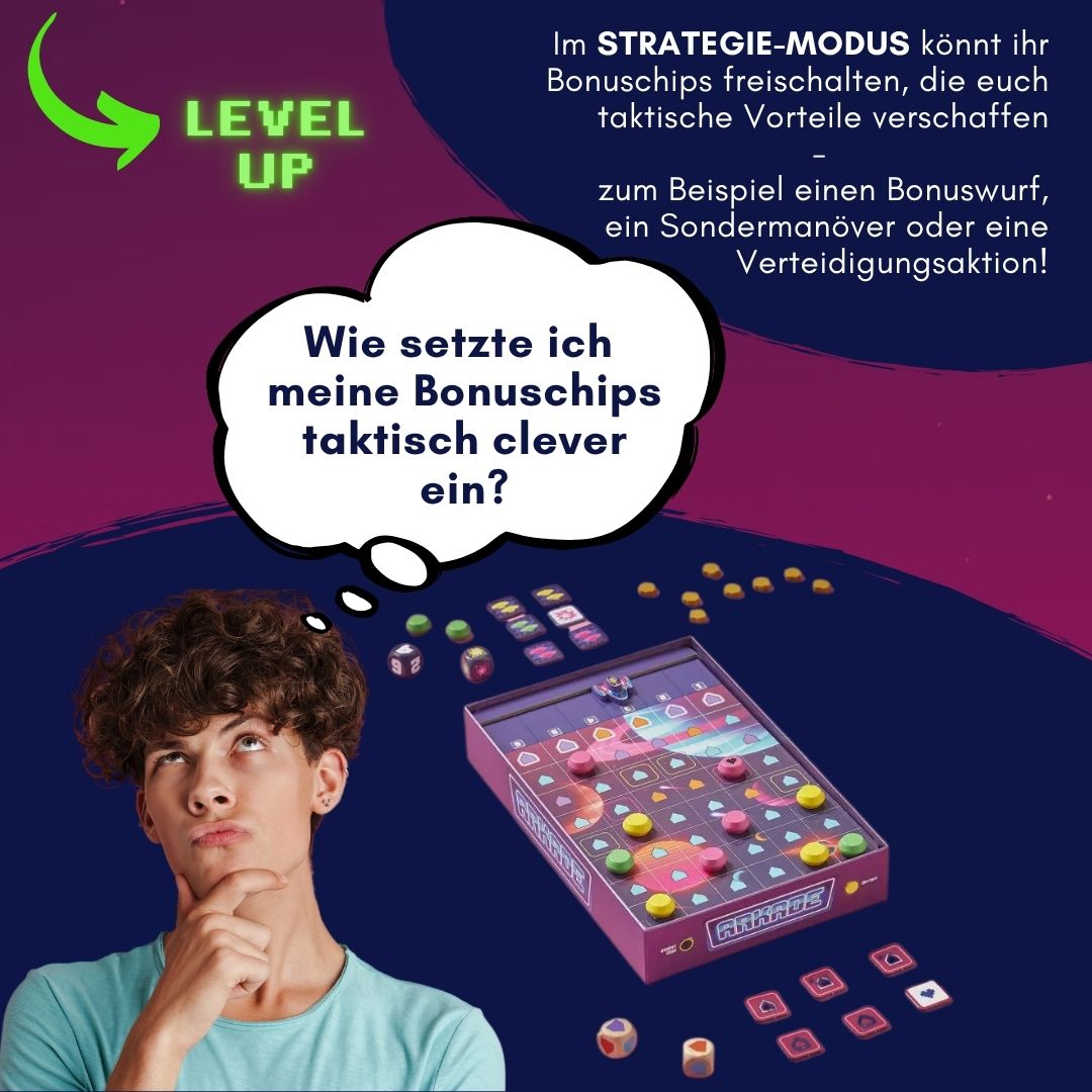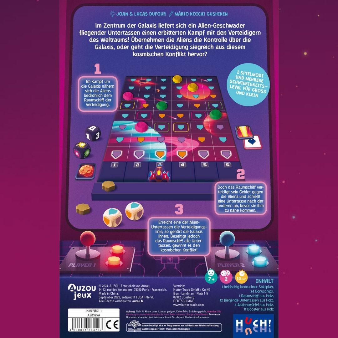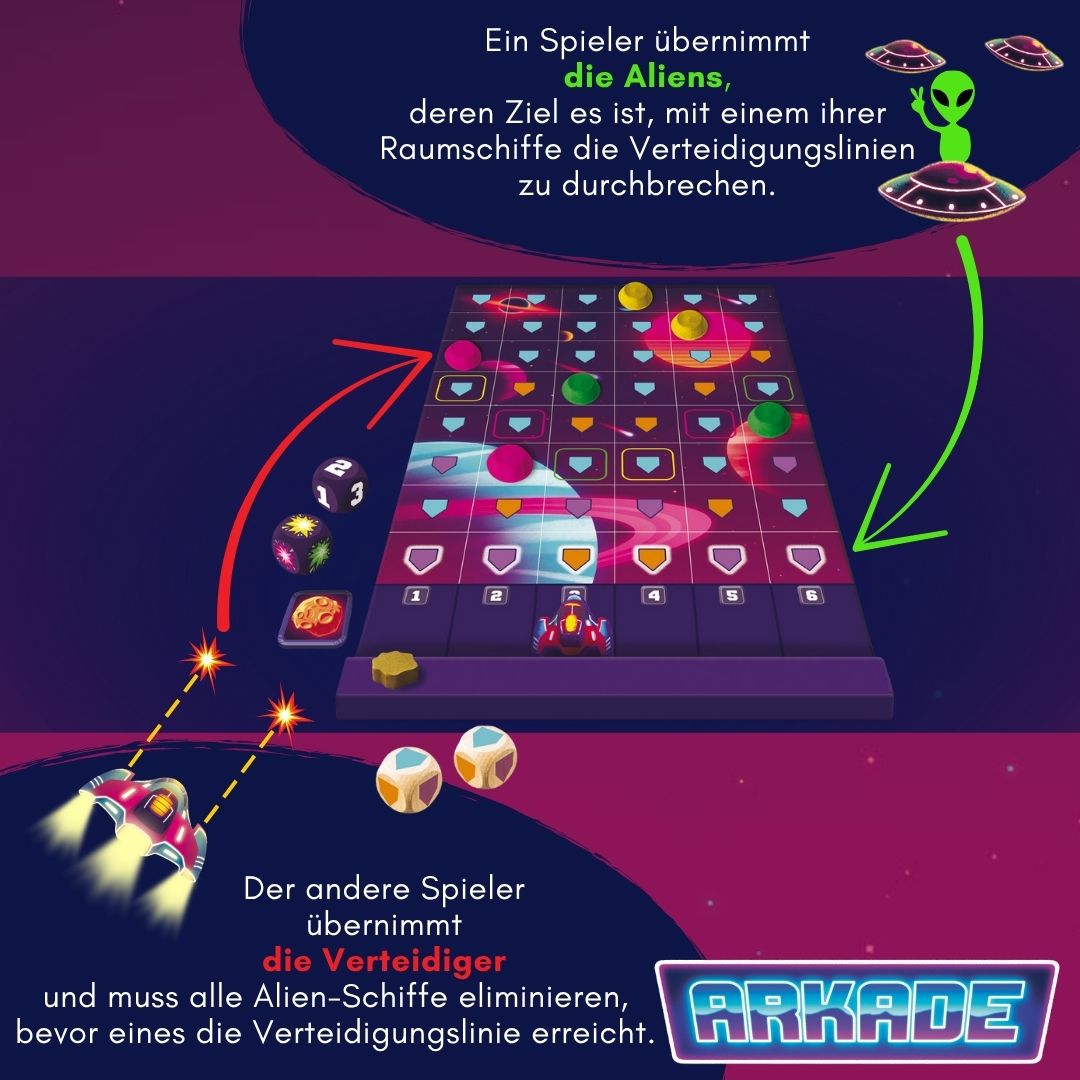 Im Zentrum der Galaxis liefert sich ein Geschwader außerirdischer Raumschiffe einen erbitterten Kampf mit den Verteidigern des Weltraums! Wer von euch wird siegreich aus diesem kosmischen Konflikt hervorgehen? Arkade basiert auf einem einfachen und intuitiven Würfelprinzip: Der Alien-Angreifer muss die gegnerischen Verteidigungslinien erreichen und der Verteidiger alle gegnerischen Schiffe eliminieren. Wahlweise könnt ihr im strategischen Modus Bonusplättchen freischalten oder euch gleichzeitig in einen rasanten Modus stürzen.