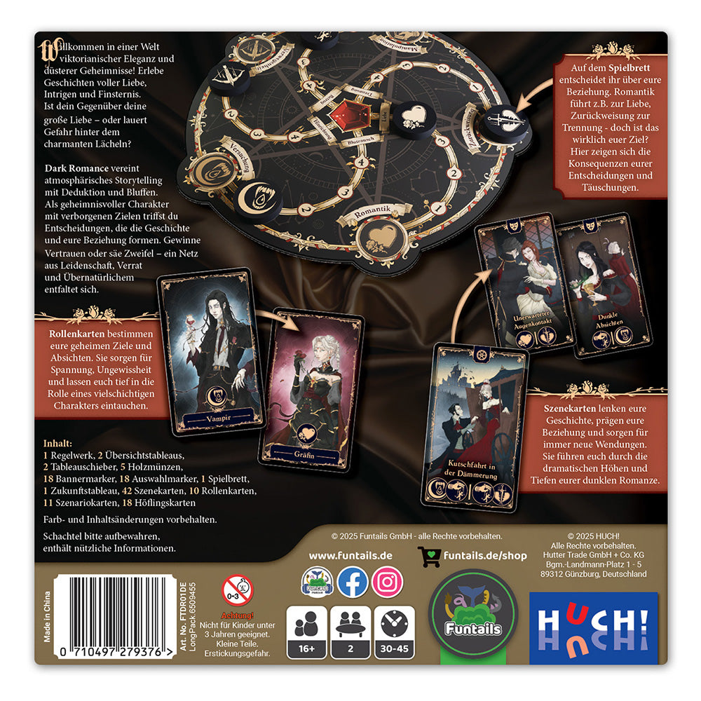 Dark Romance, ein Social Deduction Spiel für zwei Spieler*innen, erkundet die düsteren Wirrungen romantischer Verstrickungen. In einer alternativen viktorianischen Welt übernehmen die Spieler*innen die Rolle von einem der 10 Charaktere, die auf der Suche
