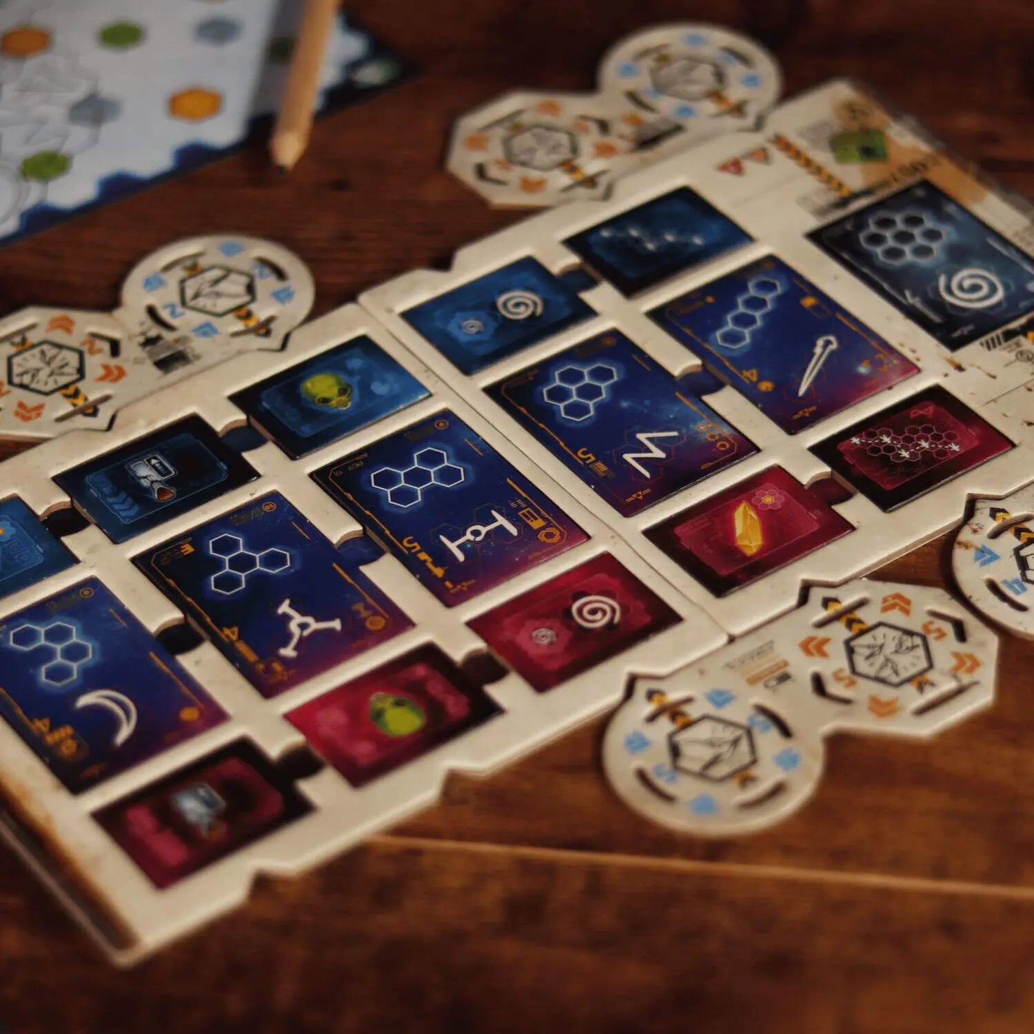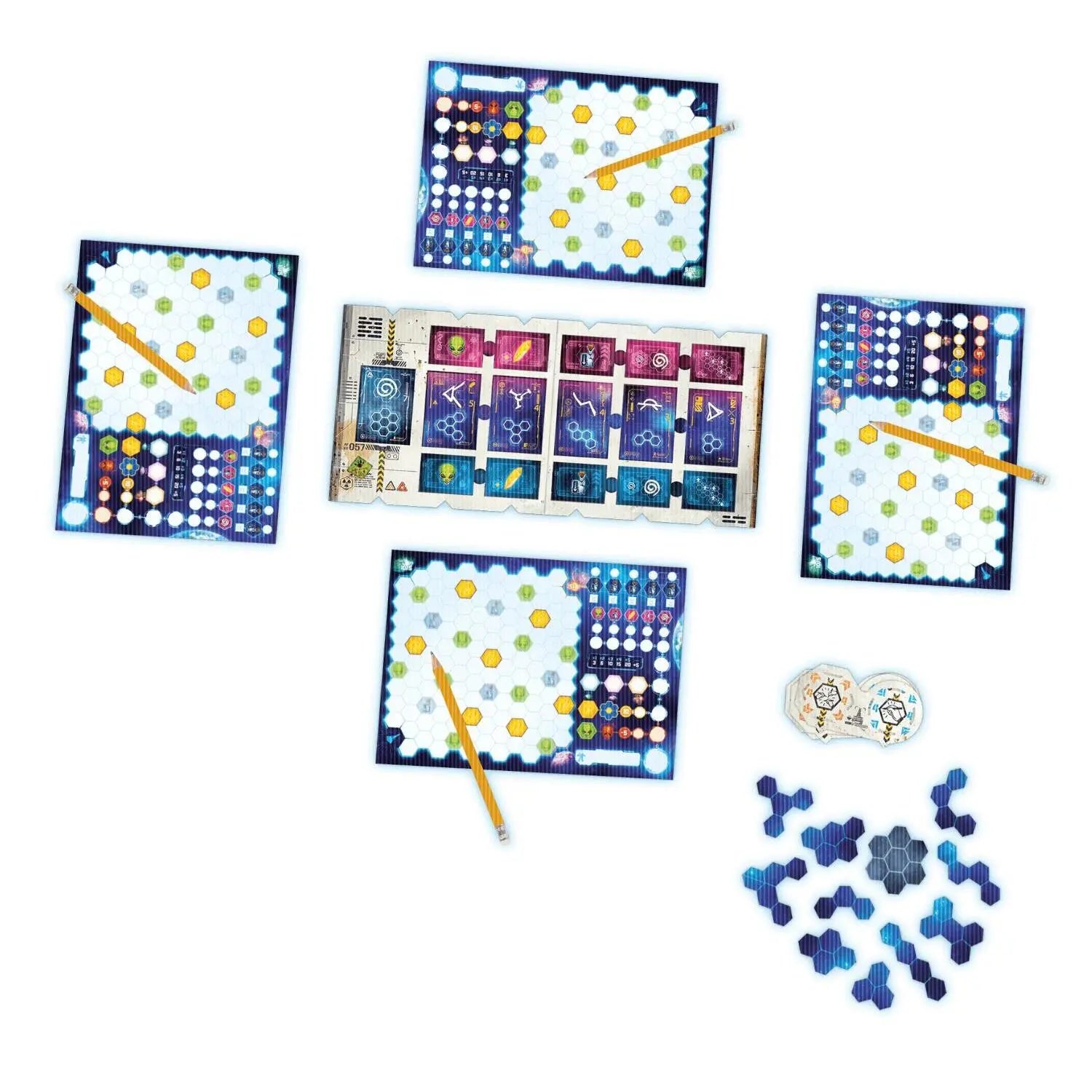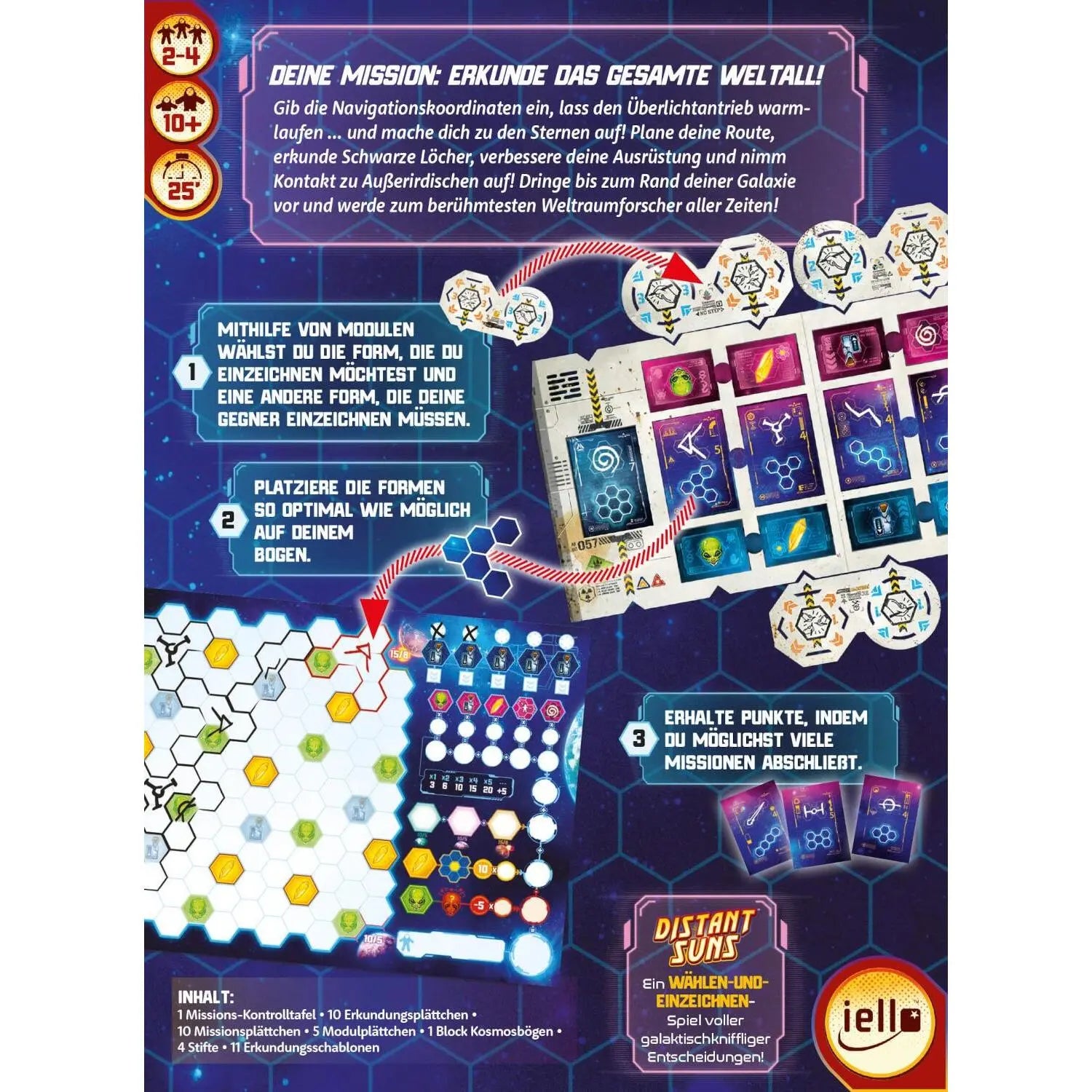 - Inhalt1 Missions-Kontrolltafel, 10 Erkundungsplättchen, 10 Missionsplättchen, 5 Modulplättchen, 1 Block Kosmosbögen, 4 Stifte, 11 Erkundungsschablonen