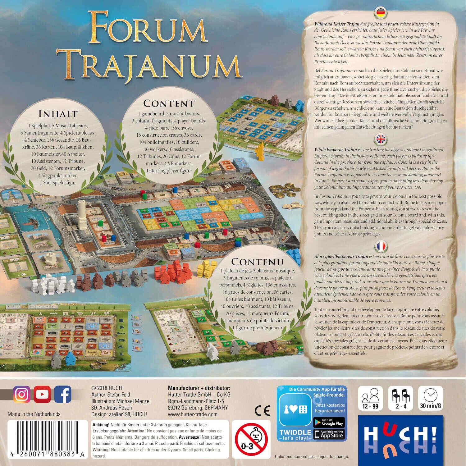 - Inhalt1 Spielplan, 5 Mosaiktableaus, 3 Säulenfragmente, 4 Spielertableaus, 4 Siegpunktregler, 136 Coloniaplättchen, 16 Baukranplättchen, 24 Straßenkarten, 12 Trajanskarten, 48 doppelte Bauwerkplättchen, 56 einfache Bauwerkplättchen, 60 Spielfiguren (Baumeister, Arbeiter, Asistenten), 12 Tribune, 20 Münzen, 12 Forumsmarker, 4 Siegpunktmarker, 1 Startspielermarker, 5 Multiplikationsmarker, 1 Anleitung