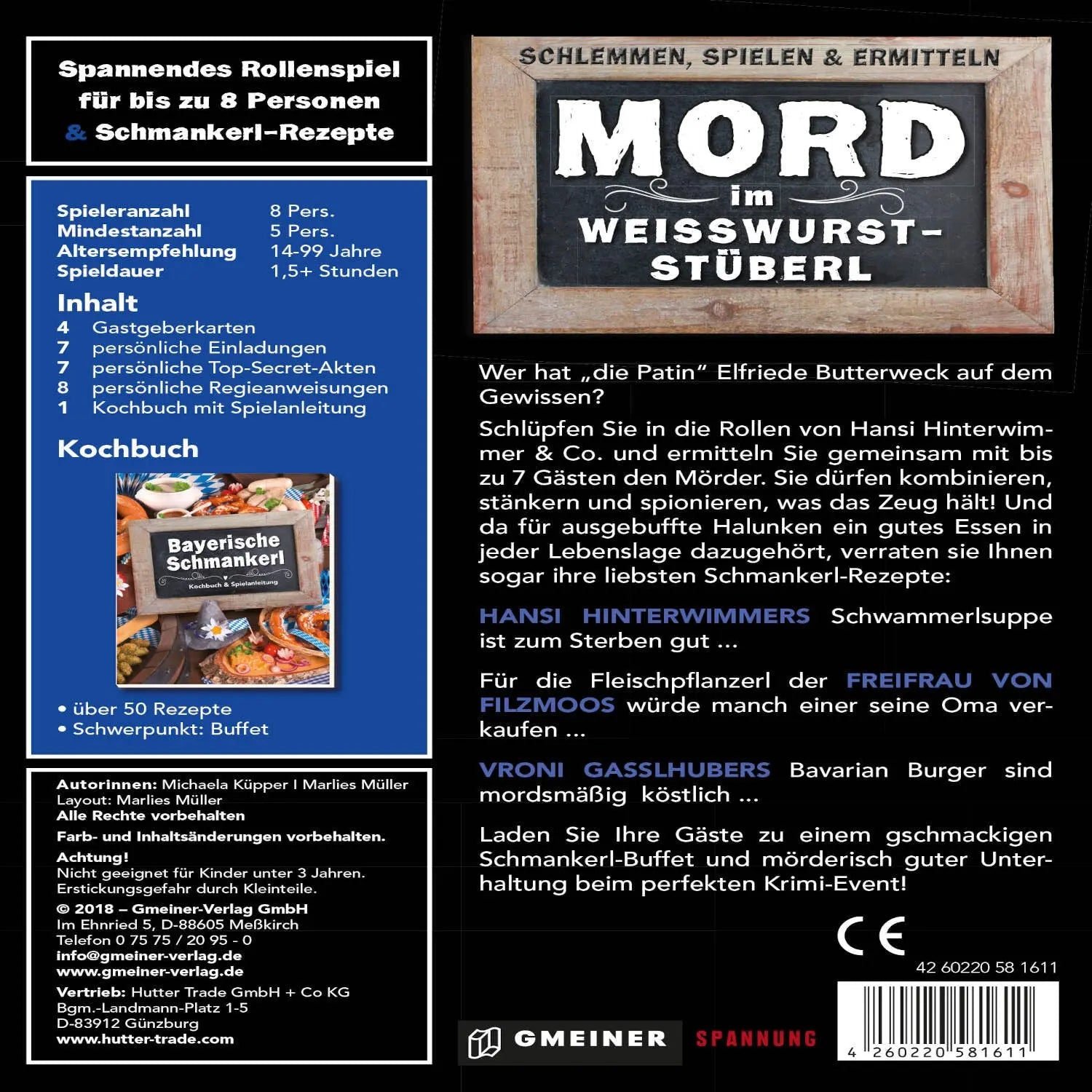 Wer hat "die Patin" Elfriede Butterweck auf dem Gewissen? Schlüpfen Sie in die Rollen von Hansi Hinterwimmer & Co. und ermitteln Sie gemeinsam mit bis zu 7 Gästen den Mörder. Sie dürfen kombinieren, stänkern und spionieren, was das Zeug hält! Und da für ausgebuffte Halunken ein gutes Essen in jeder Lebenslage dazugehört, verraten sie Ihnen sogar ihre liebsten Schmankerl-Rezepte: HANSI HINTERWIMMERS Schwammerlsuppe ist zum Sterben gut... Für die Fleischpflanzerl der FREIFRAU VON FILZMOOS würde manch einer seine Oma verkaufen... VRONI GASSLHUBERS Bavarian Burger sind mordsmäßig köstlich...Laden Sie Ihre Gäste zu einem gschmackigen Schmankerl-Buffet und mörderisch guter Unterhaltung beim perfekten Krimi-Event!