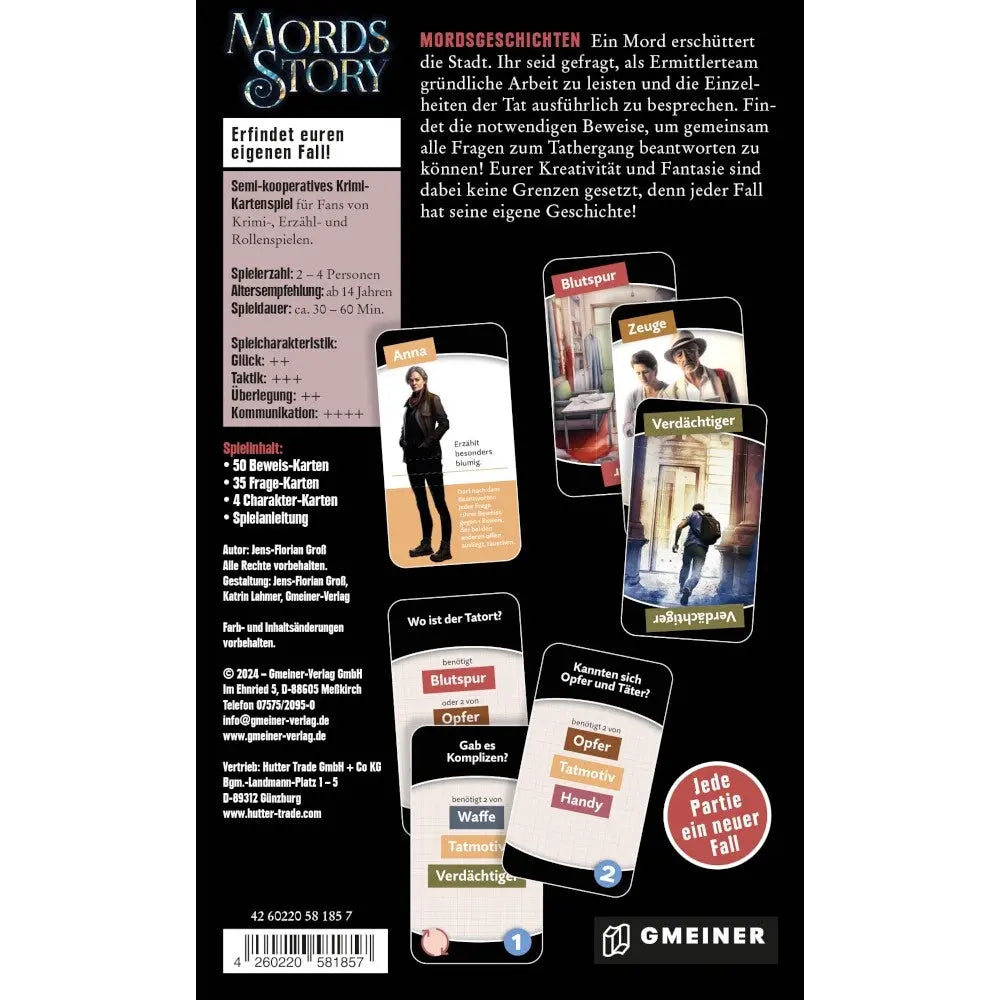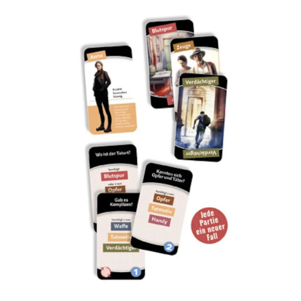 Ein Mord erschüttert die Stadt. Ihr seid gefragt, als Ermittlerteam gründliche Arbeit zu leisten und die Einzelheiten der Tat ausführlich zu besprechen. Findet die notwendigen Beweise, um gemeinsam alle Fragen zum Tathergang beantworten zu können! Eurer Kreativität und Fantasie sind dabei keine Grenzen gesetzt, denn jeder Fall hat seine eigene Geschichte!