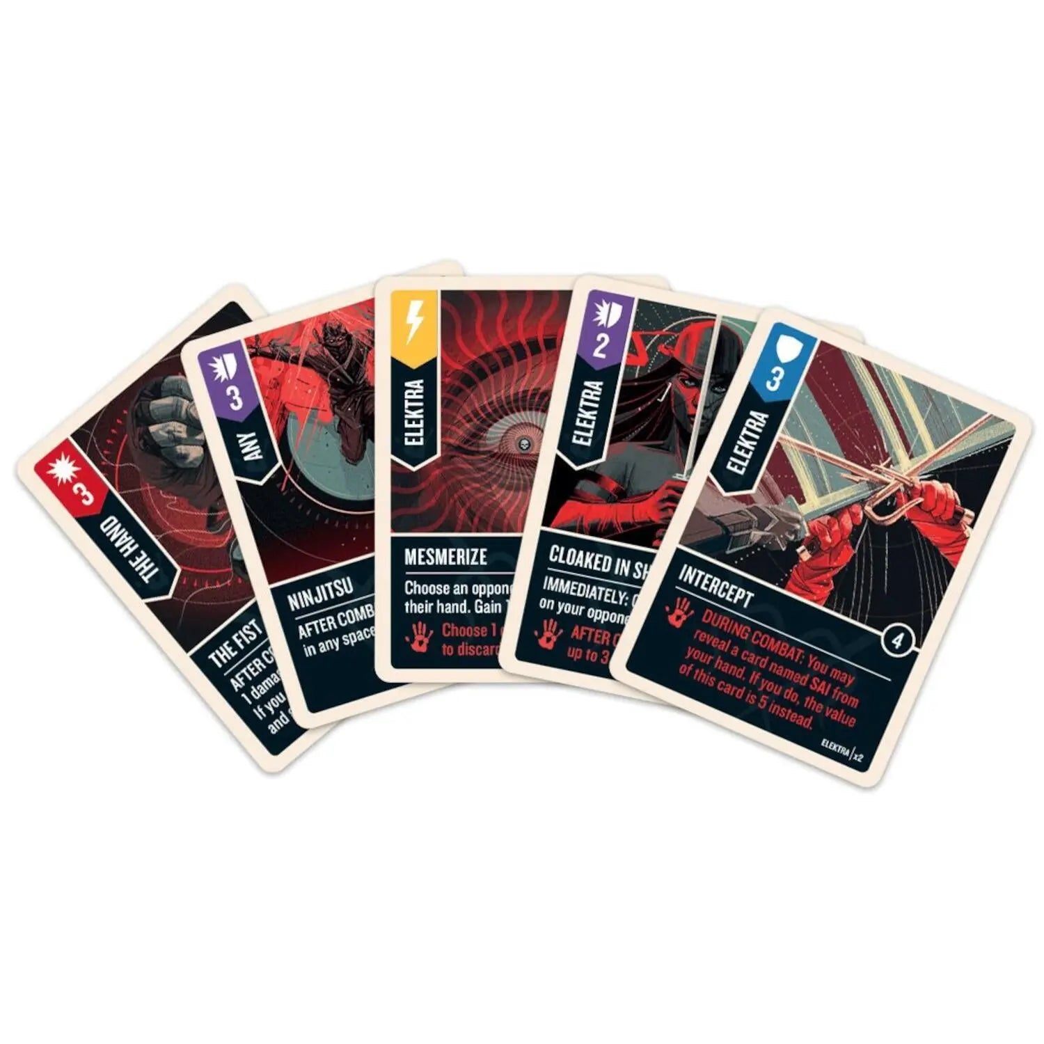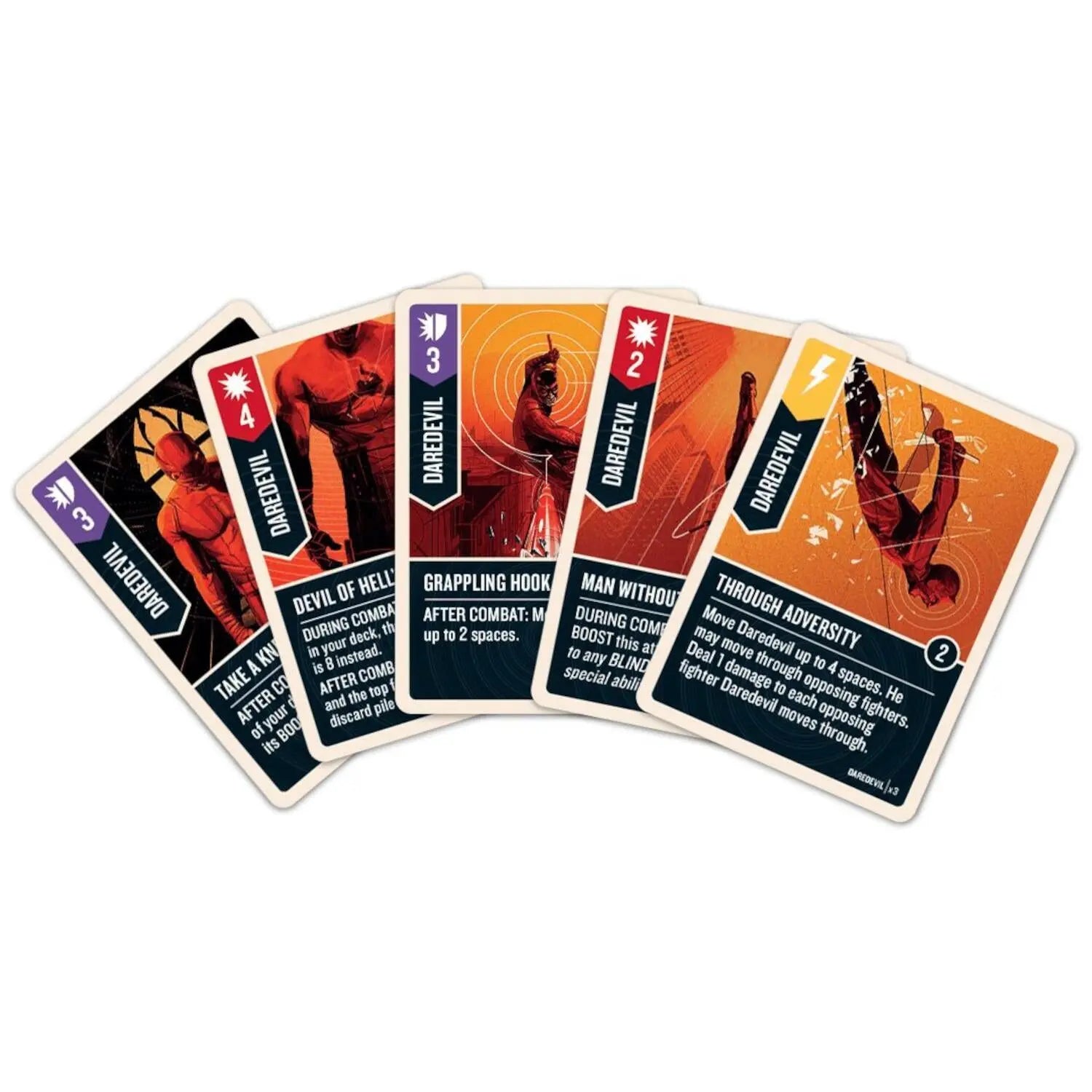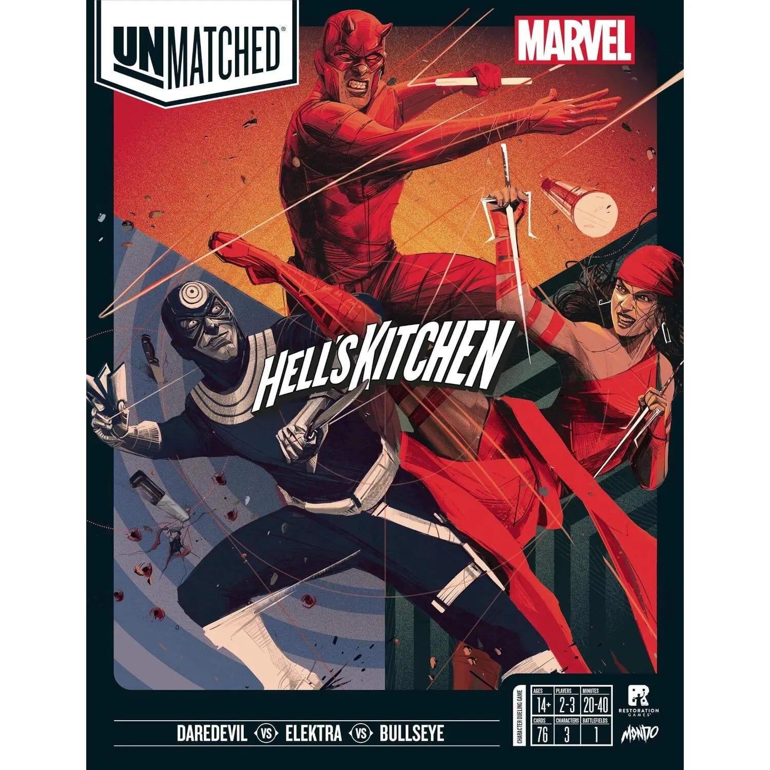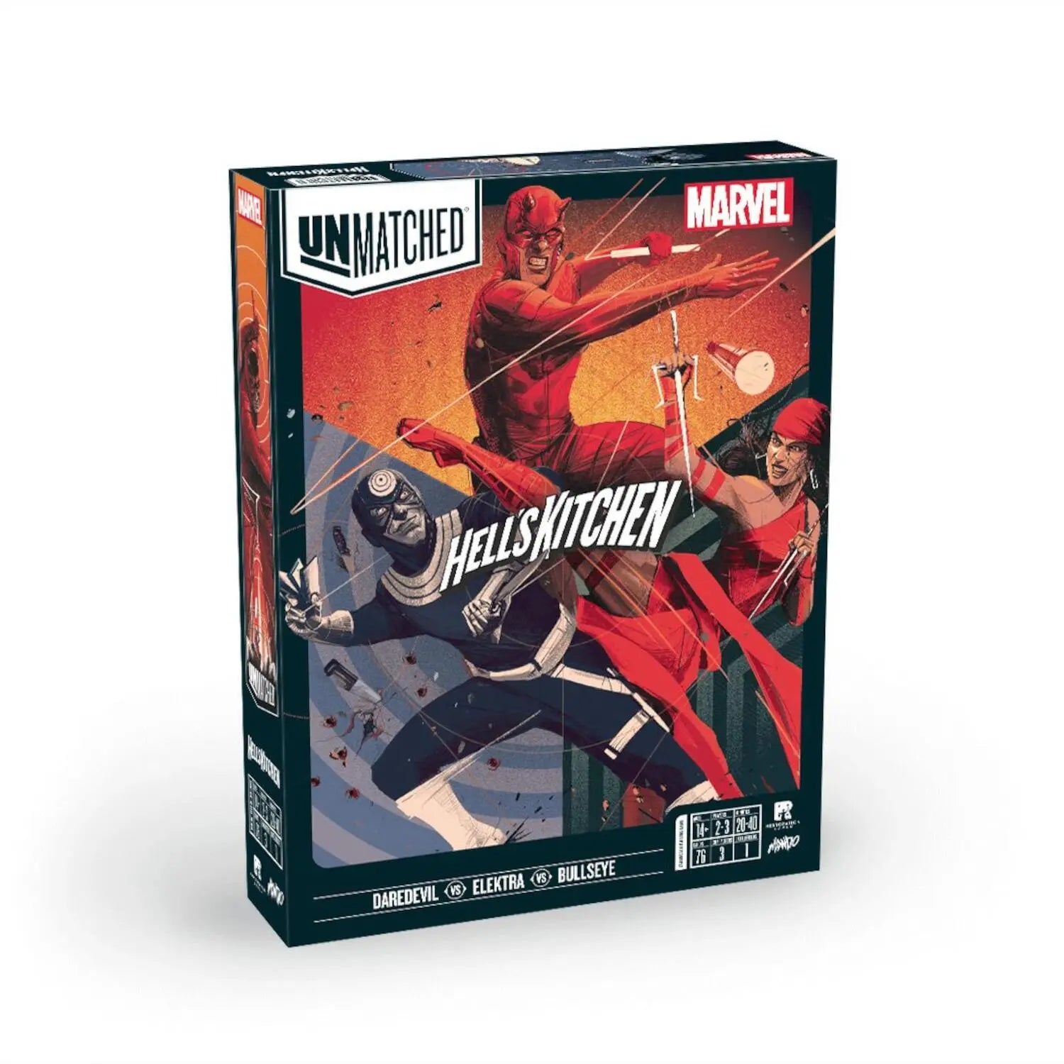 Unmatched is a highly asymmetrical miniature fighting game for two or four players. Each hero is represented by a unique deck designed to evoke their style and legend. Tactical movement and no-luck combat resolution create a unique play experience that rewards expertise, but just when you've mastered one set, new heroes arrive to provide all new match-ups. Unmatched: Hell's Kitchen features three characters from the Marvel comics universe: Daredevil, Elektra, and Bullseye