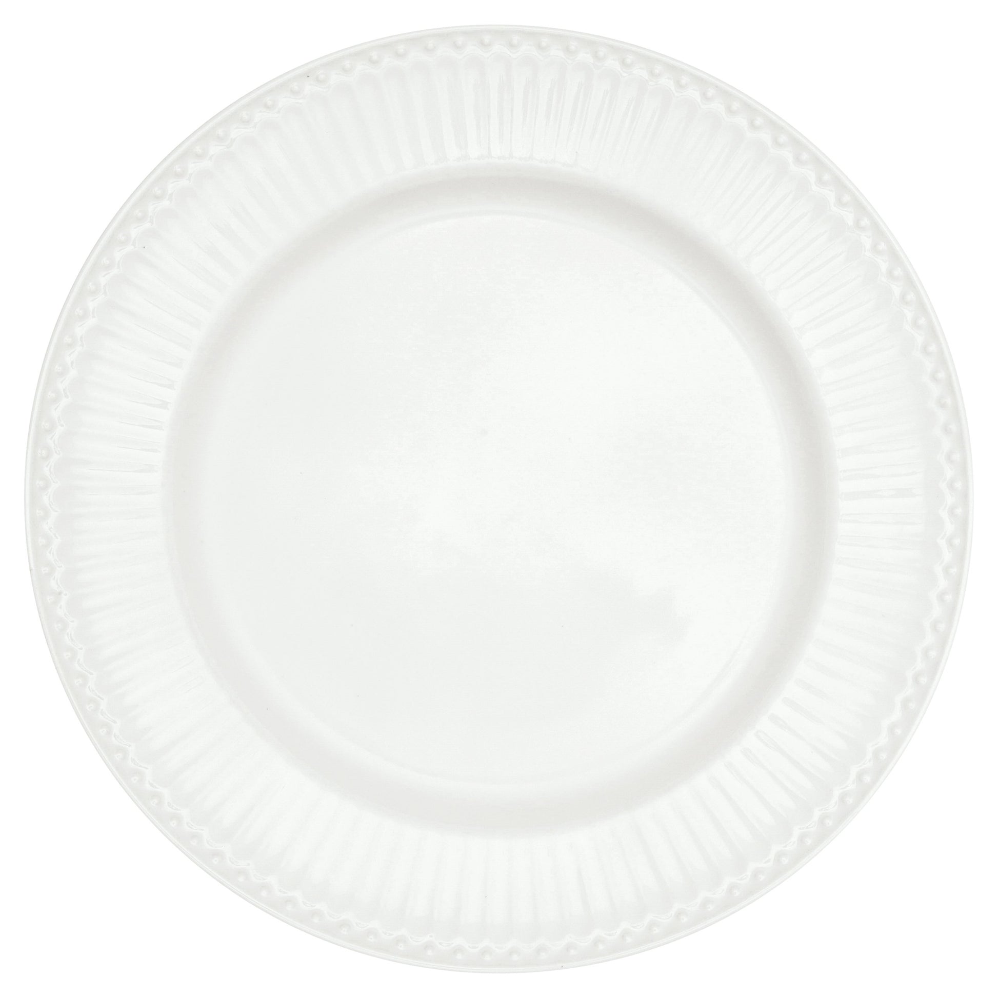 Die "Alice"-Kollektion von GreenGate verbindet nostalgische Elemente mit moderner Formensprache — die Reliefstruktur am Rand wirkt wie ein zarter Rahmen für deine Mahlzeiten und verleiht jedem Gericht eine feine Bühne. Durch die reduzierte Farbgebung bleibt der Teller vielseitig und zeitlos.
