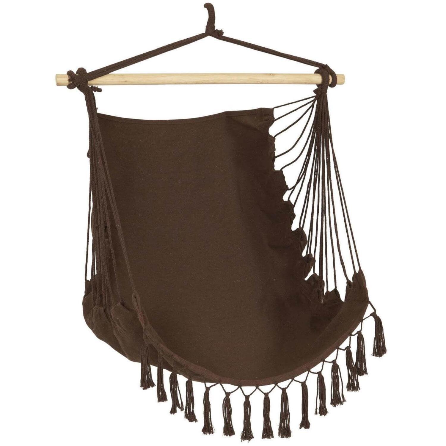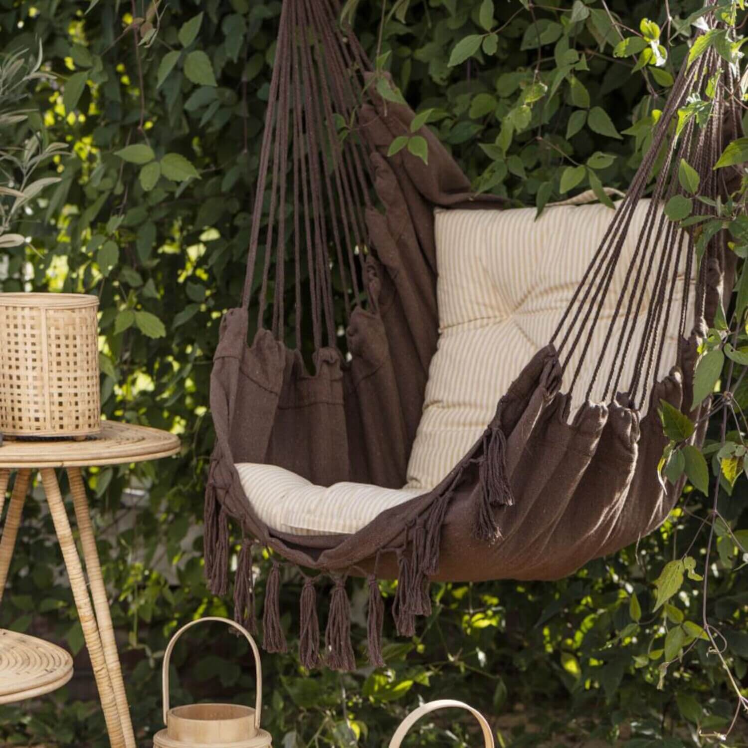 Komm und entspann dich im schönen Hängesessel aus Melange-Stoff. Der fein melierte Look verleiht dem braunen Sessel eine besondere Note.