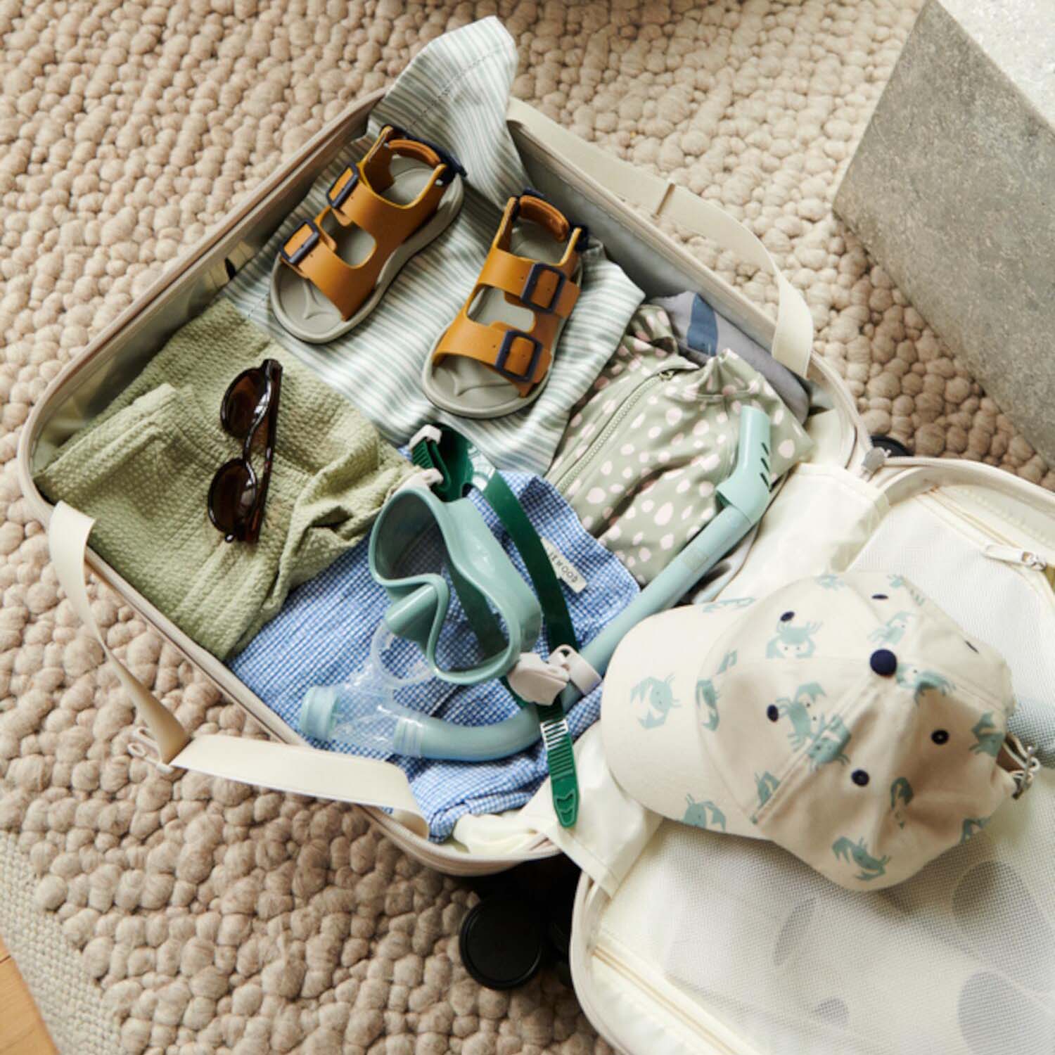 Stylisch reisen - das können schon die Kleinsten: mit dem zauberhaften Hartschalenkoffer "Hollie" von Liewood. Der quadratische Kabinenkoffer glänzt mit seinem wundervollen Design in Kombination mit Komfort und Geräumigkeit. Vier Rollen und ein praktischer Teleskopgriff erleichtern das Handling. So findet alles Platz, was für unsere lieben Kleinen auf Reisen nicht fehlen darf: Kleidung, Kuscheltiere, Spielsachen und Bücher. Gute Reise!