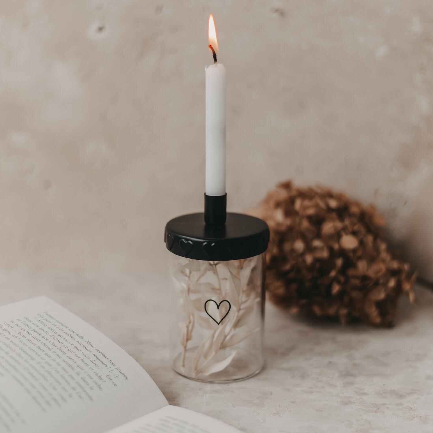 Aus einem ganz normalen Vorratsglas wird mit diesem zarten Kerzenhalter im Handumdrehen ein stimmungsvolles Lichtobjekt: Der schwarze Metallring mit feiner Herzprägung am Rand sitzt elegant auf einem Glas mit etwa 6 cm Durchmesser und schafft Raum für romantisches Licht. In den Halter passt eine klassische Tannenbaum-Kerze, die gemeinsam mit dem Herzmotiv eine warme und liebevolle Atmosphäre zaubert.