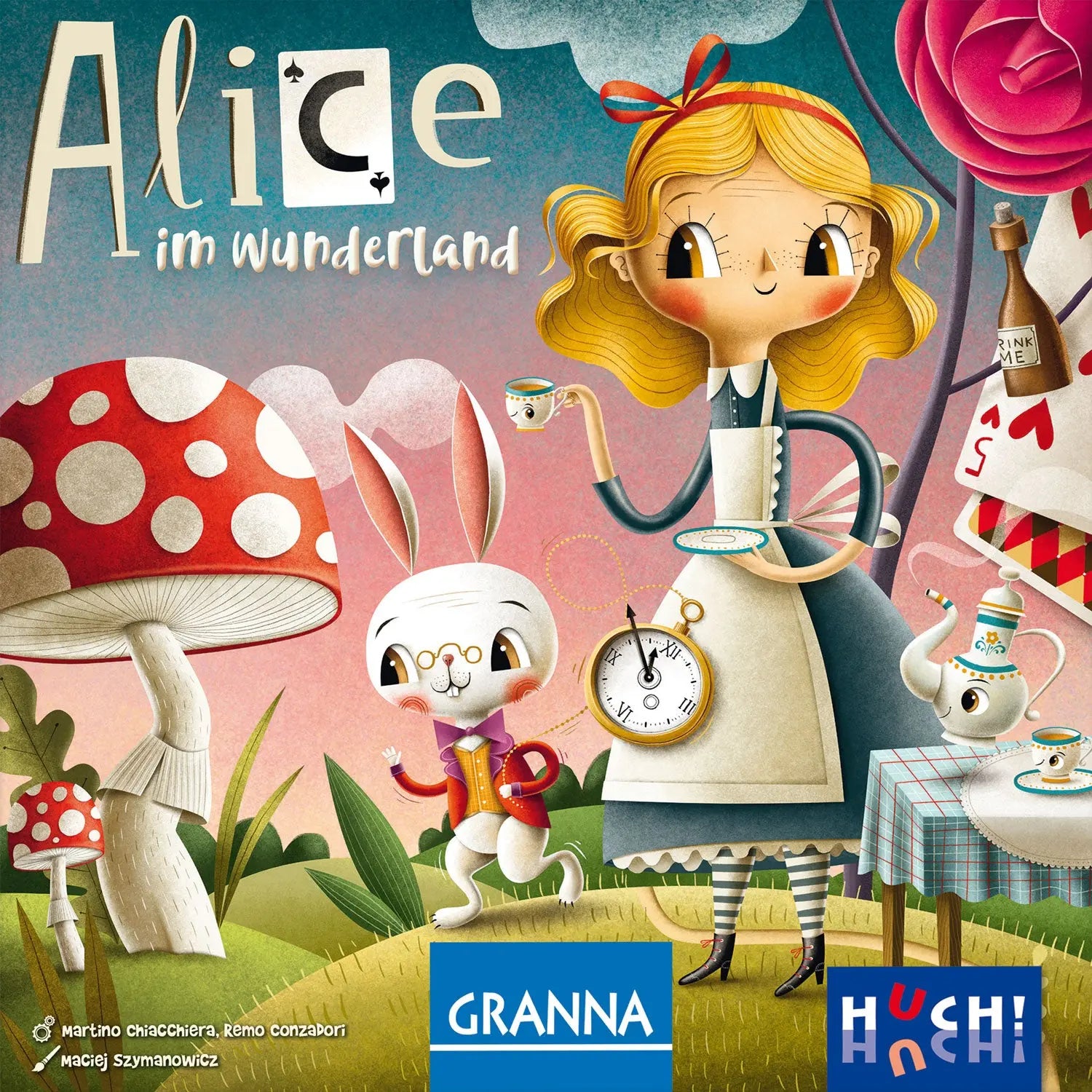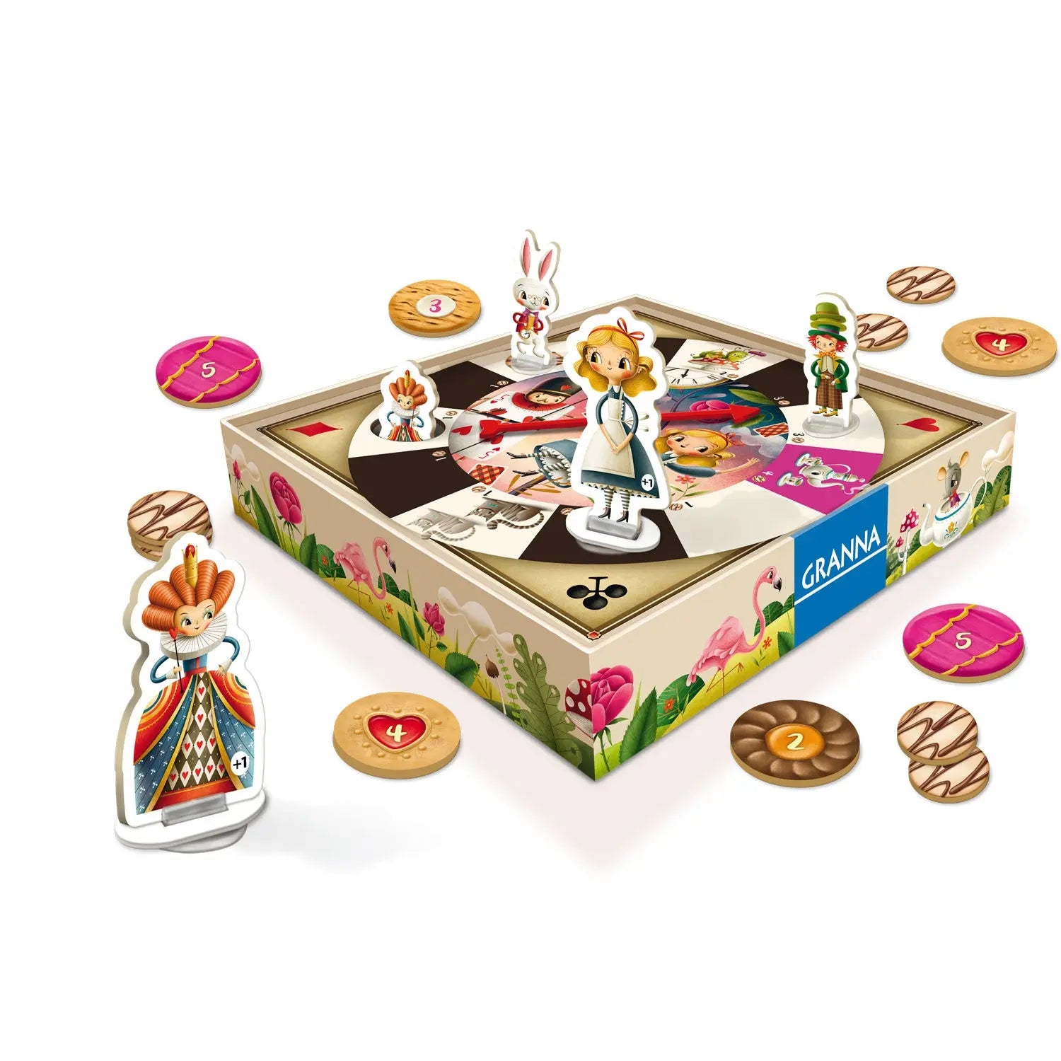 Lasst euch ins Wunderland von Alice entführen! Sammelt dort als Hutmacher, Kaninchen, Herzkönigin oder Alice so viele Kekse wie ihr könnt. Mit Mini-Spielkarten bewegt ihr euch im Uhrzeigersinn auf dem Spielplan. Aufgepasst: Von den 3 Handkarten dürft ihr nur die linke oder rechte Karte spielen. Rückt dann die entsprechende Zahl an Feldern vor. Kommt ihr auf oder über das Teeparty-Feld, werdet ihr mit großen Keksen belohnt! Auf dem Keks-Feld dürft ihr den Uhr-Glückszeiger drehen und so viele kleine Kekse nehmen wie auf dem Feld angegeben. Landet ihr auf der Raupe, lässt sie eure Figur größer oder kleiner werden. Wunderbar - denn seid ihr groß, könnt ihr nicht ins Kaninchenloch fallen! Wer im Loch sitzt, kann sich nur mit einem guten Zeigerdreh wieder befreien. Sind alle 11 Karten gespielt, ist die Zeit leider um. Wer konnte die meisten Kekspunkte einsammeln?