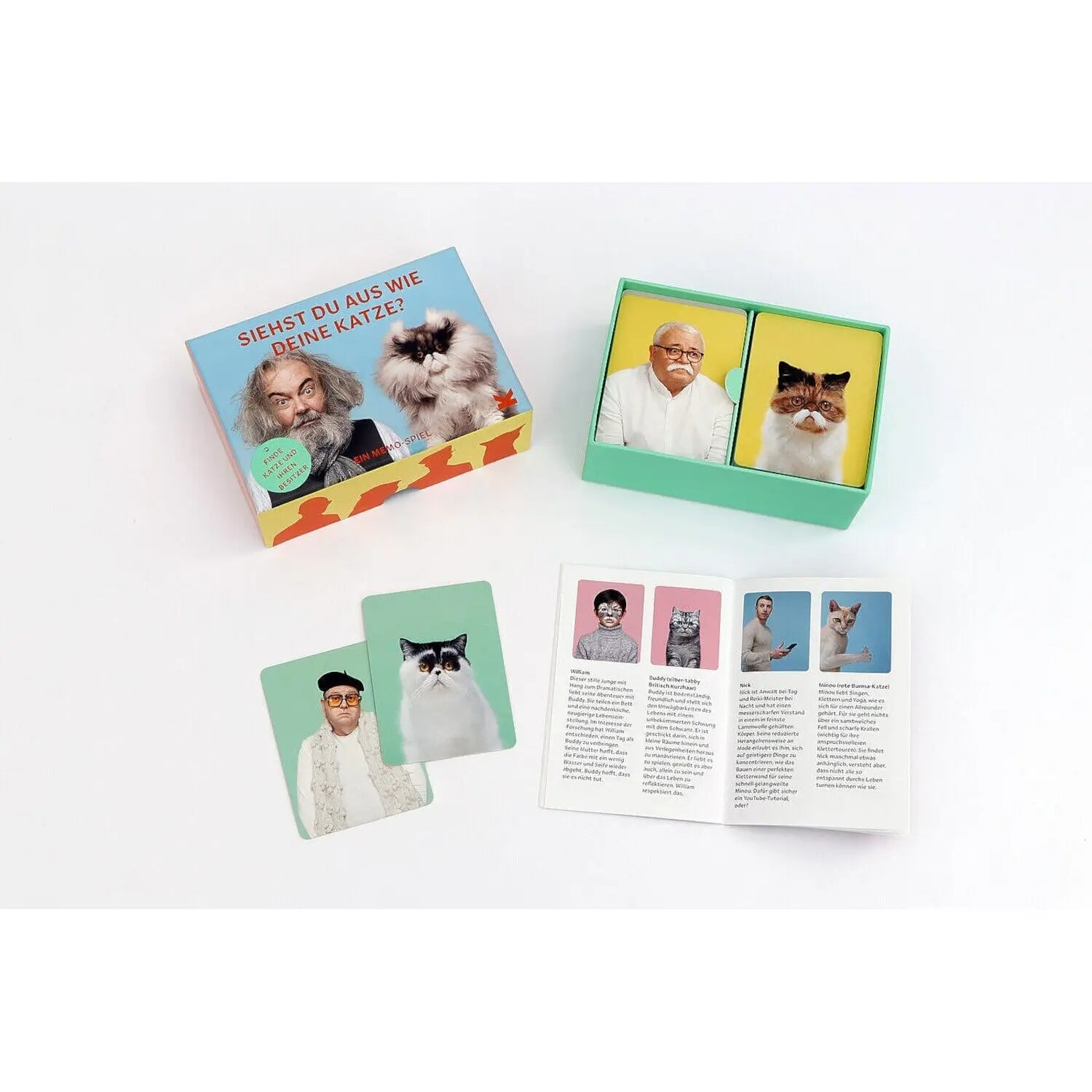 Bringen Sie in diesem augenzwinkernden Memo-Spiel Katzen und ihre Besitzer zusammen. Das Booklet präsentiert 25 humorvolle, pointierte Texte, die Hinweise geben, welcher Mensch zu welcher Katze gehört.