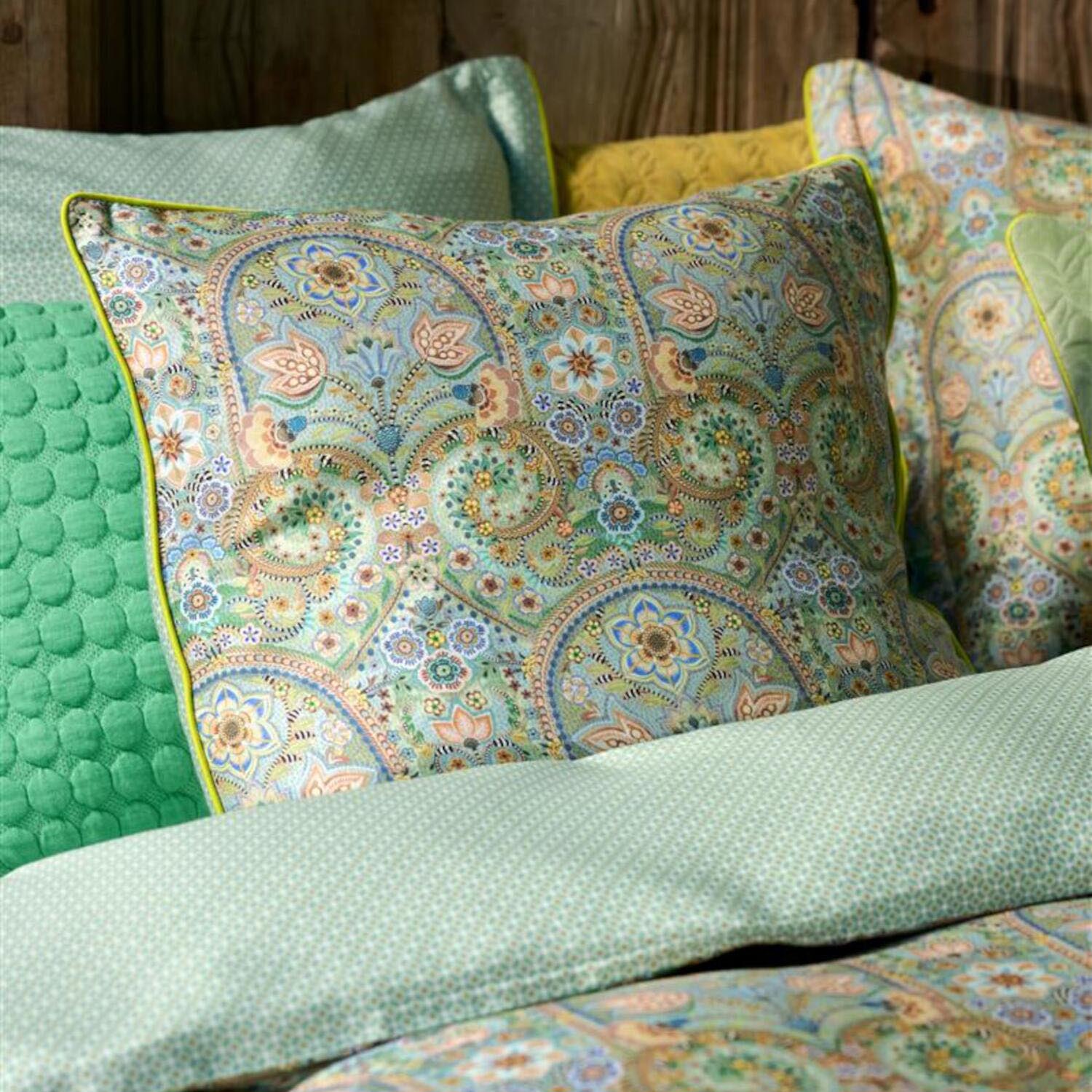 Das hochwertige Kissen "Kikoy" von Pip Studio besteht aus zahlreichen kleinen Blumen, die zusammen ein paisleyartiges Bogenmotiv bilden. Gefertigt aus luxuriösem Satin, verleiht es deinem Schlafzimmer eine besonders edle Note. Die Wendeseite des Kissens zeigt einen ansprechenden Kacheldruck, sodass du je nach Stimmung das Design variieren kannst. Das Kissen ist auf beiden Seiten mit einem gesteppten Rand und einer leuchtend bunten, runden Paspel versehen, was für eine luxuriöse Optik sorgt. Der einzigartige Schleifenverschluss ermöglicht es, das Kissen beidseitig zu verwenden, wodurch ein spielerischer Mix&Match-Effekt auf deinem Bett entsteht.