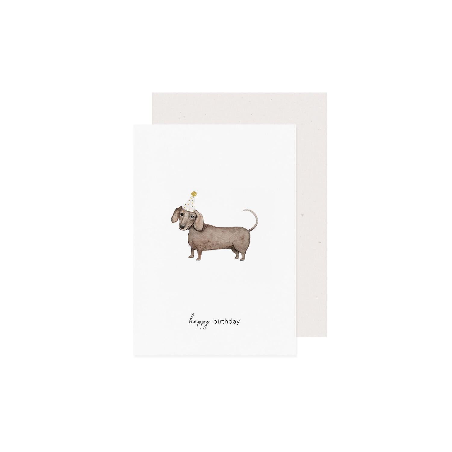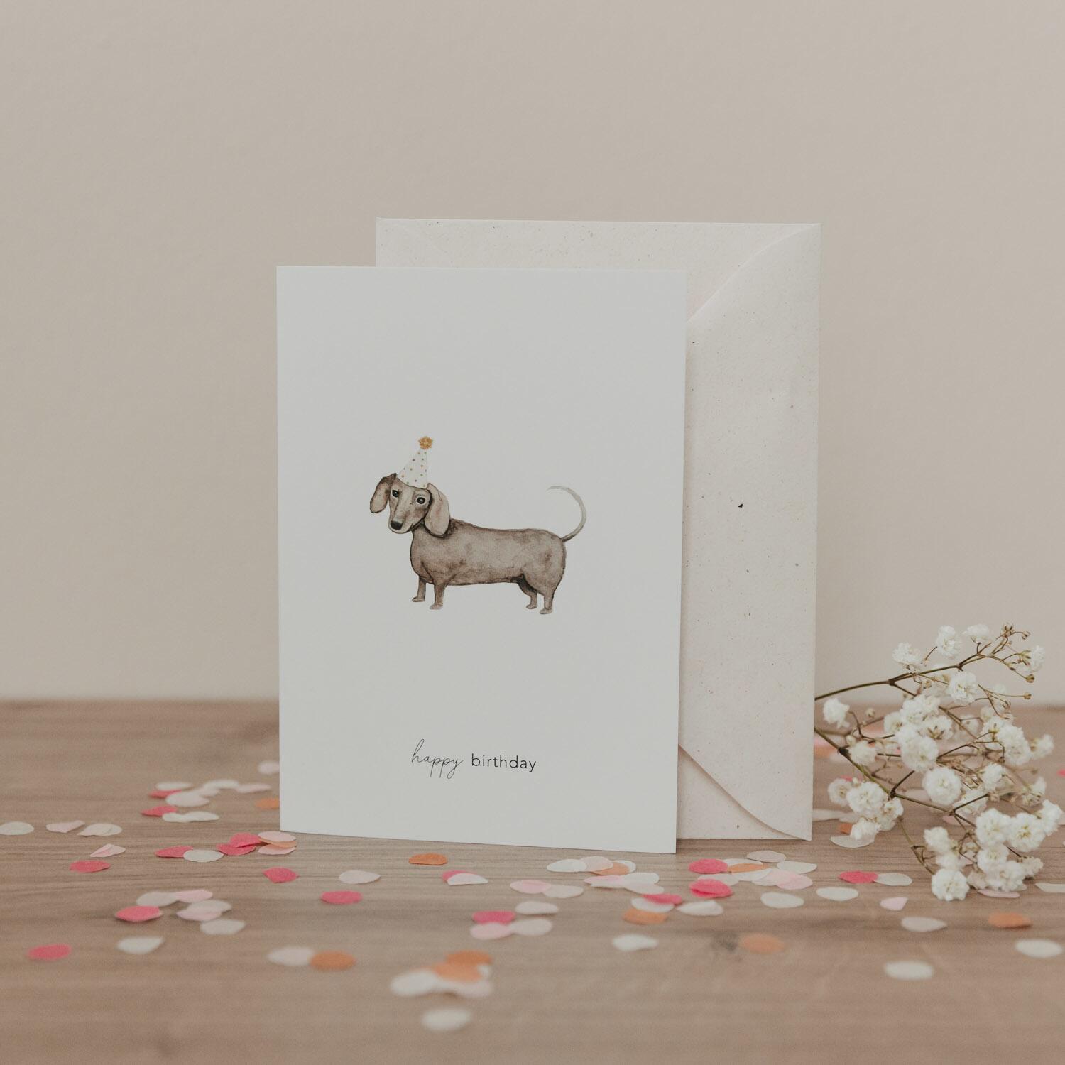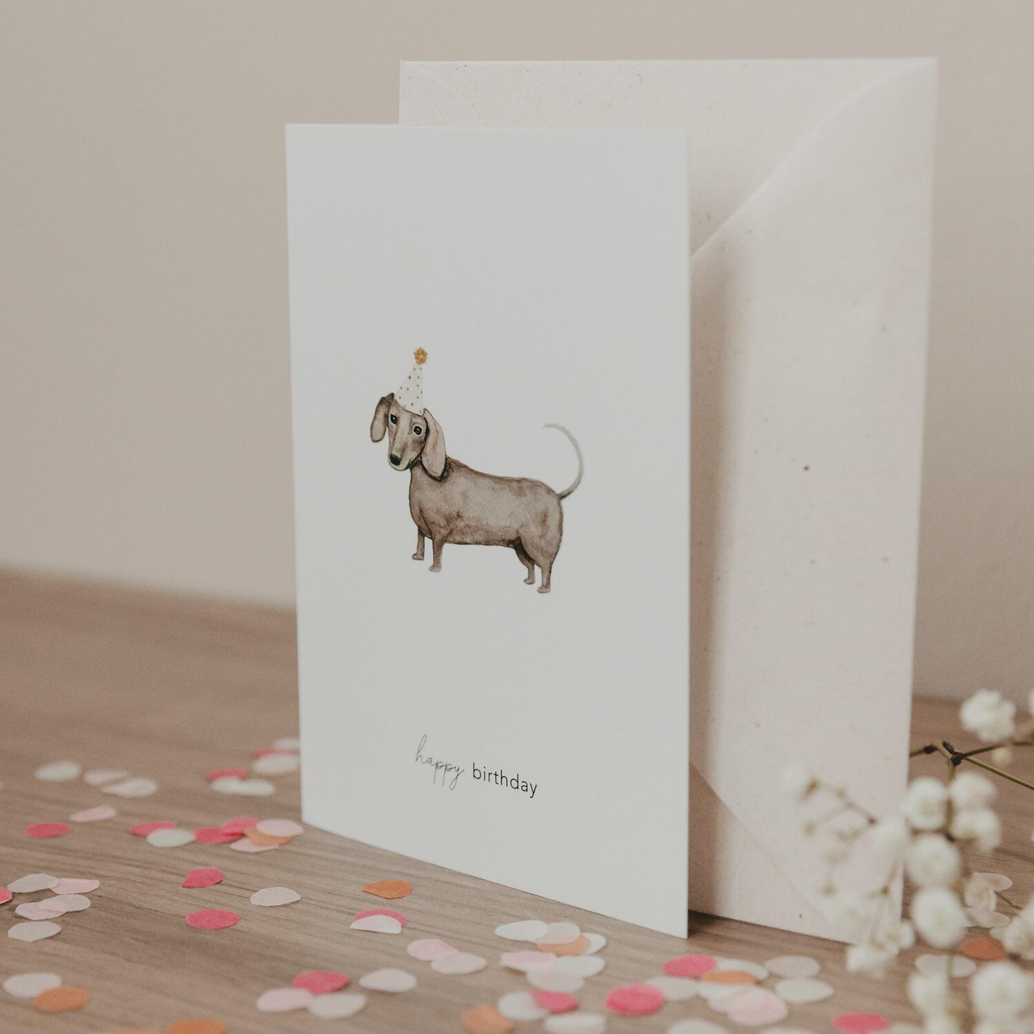 Der kleine Dackel mit Partyhut wandert direkt ins Herz – mit der wundervollen Klappkarte „Geburtstagsdackel“ bringst du gute Laune und ein Schmunzeln zum Ausdruck. Die zauberhafte Illustration des Dackels, kombiniert mit dem herzlichen Spruch „Happy Birthday“, macht diese Karte zu einem ganz besonderen Gruß. Im Inneren findest du großzügigen Platz für deine persönliche Botschaft.