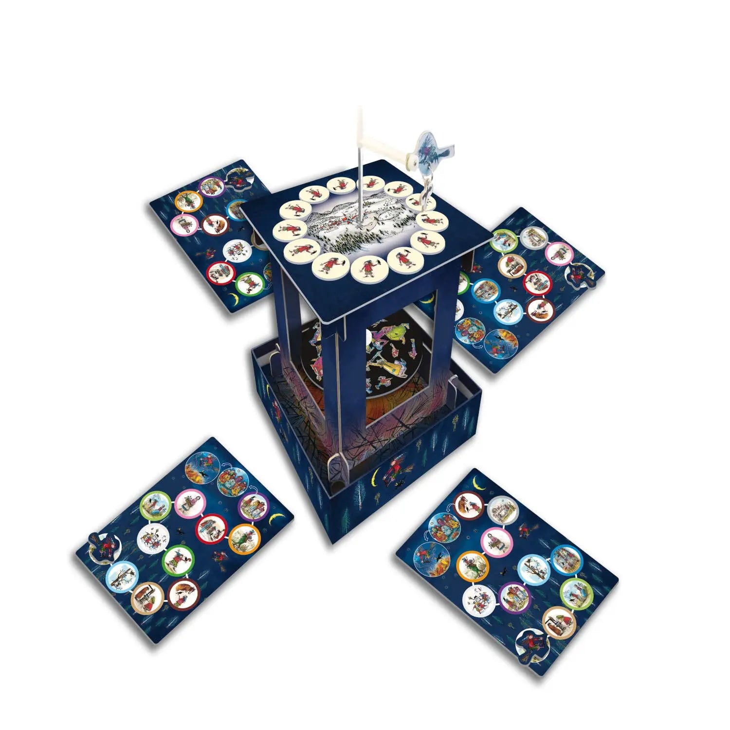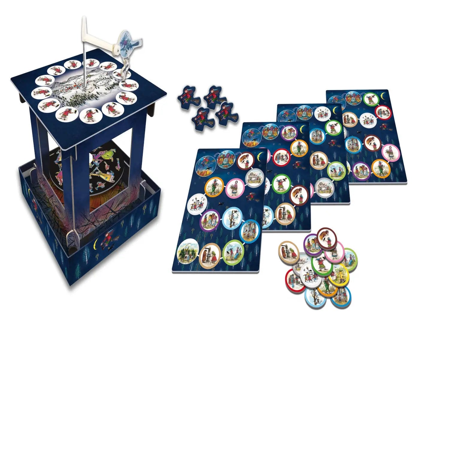 Im Spiel "Die kleine Hexe" erleben die Kinder die Geschichte des Buches. Die kleine Hexe begeht viele gute Taten, um den großen Hexen zu beweisen, dass sie eine gute Hexe ist. Die Spieler müssen die guten Taten auf ihren Spielfeldern der Reihe nach unter den verdeckten Plättchen auf dem Spielplan finden, indem sie die Hexe, die über dem Spielplan fliegt, stoppen. Memo-Spiel mit innovativem Drehmechanismus zum Kinderbuchklassiker "Die kleine Hexe".