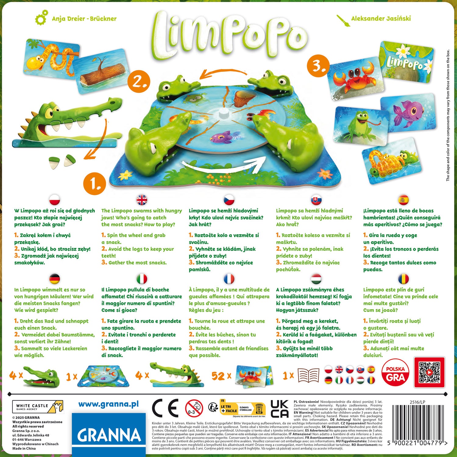Am Fluss Limpopo sind die Krokodile immer hungrig! Jeder von euch bekommt ein Krokodil und geht damit auf Jagd. Das Rad im Fluss mit den tierisch-leckeren Snacks dreht sich vor euren Augen. Sobald ihr es mit eurem Kroko stoppt, dürft ihr eine Karte bei jemanden ziehen. Ist es ein Snack, nehmt ihr die Karte auf die Hand. Erwischt ihr aber einen Baumstamm, verliert ihr einen Zahn! Hat euer Kroko ein Tier im Strudel erwischt, das ihr bereits als Karte auf der Hand habt? Dann dürft ihr die Karte ablegen und das Tier fressen. Ihr spielt so lange, bis alle Snackkarten weg sind oder mindestens eines der Krokodile alle seine Zähne verloren hat. Gewonnen hat, wer das Krokodil mit dem vollsten Bauch und den meisten Zähnen hat.