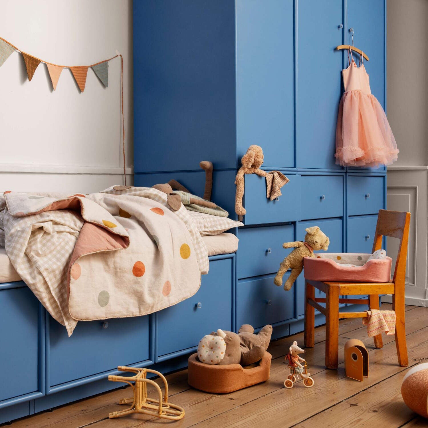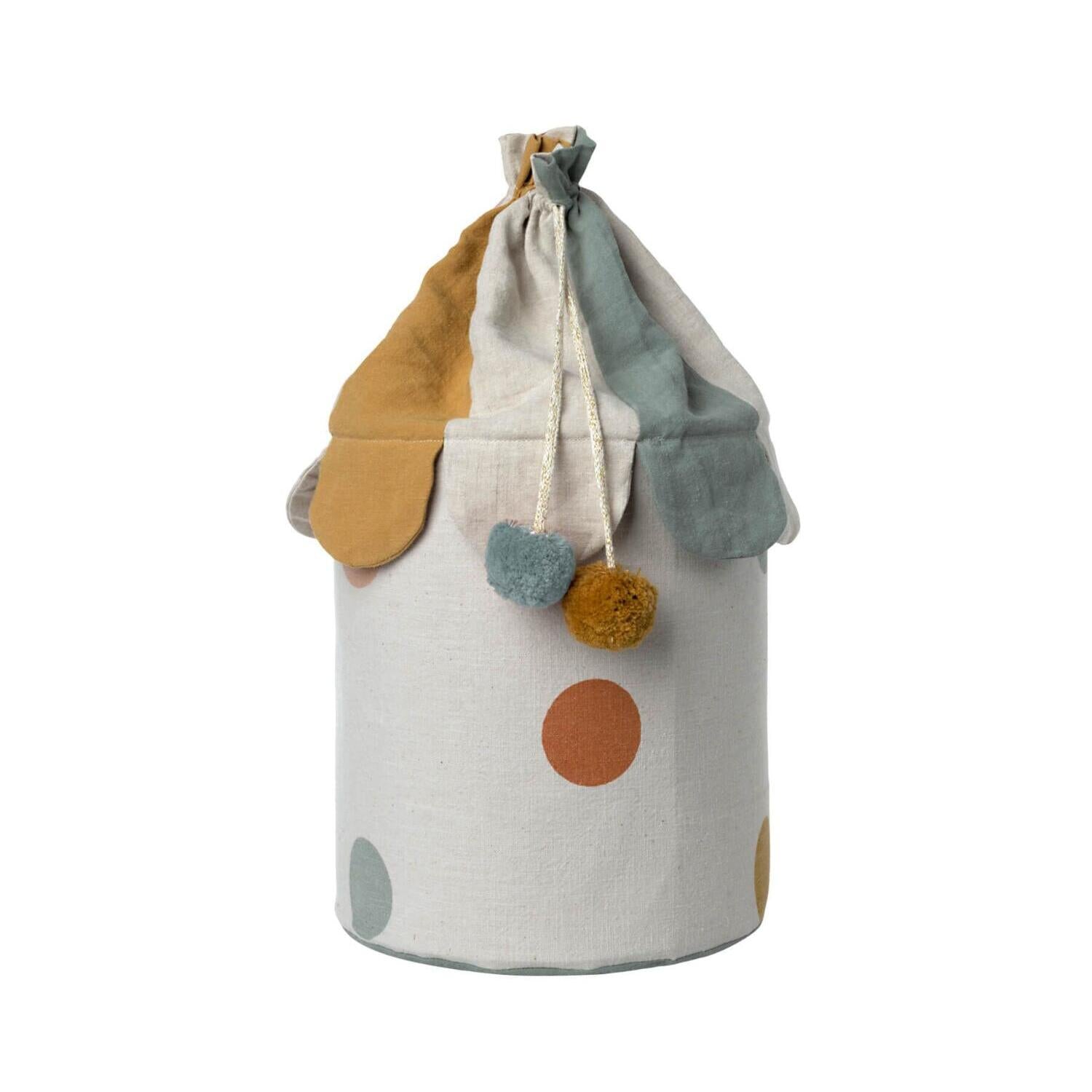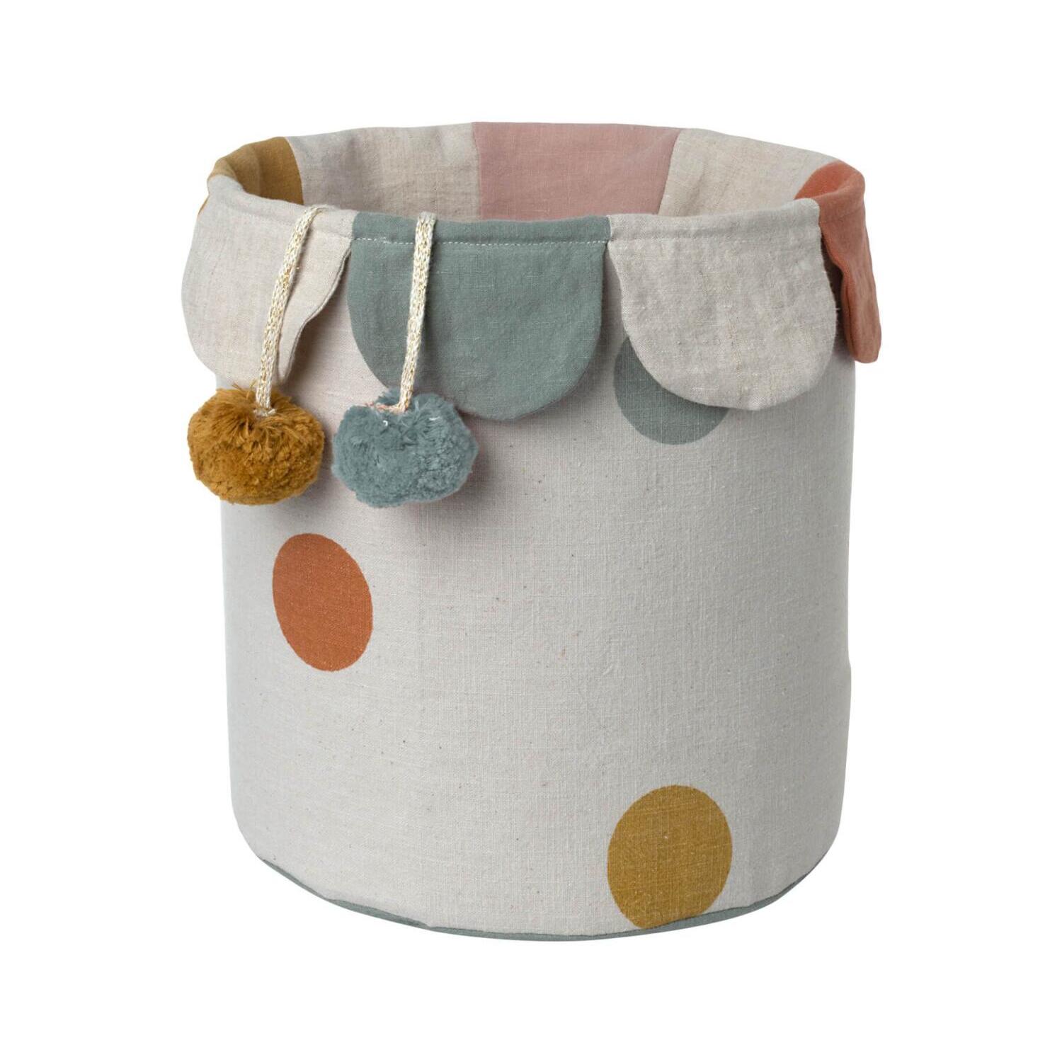 Endlich Ordnung! Und diese kann so schön und stylisch sein. Denn Kuscheltiere, Spielzeugautos und allerlei Krimskrams findet ihren Platz in diesem wundervollen Aufbewahrungskorb von Maileg. Im fröhlichen Punktedesign präsentiert sich der Stoffkorb mit herrlich verspielten Details. So lässt sich das Hab-und-Gut mit einem Kordelzug praktisch verschließen, lustige Pompons machen den Look dabei perfekt. Ein fester Standboden sorgt für Halt. Praktisch & stylisch - eine gelungene Kombination!