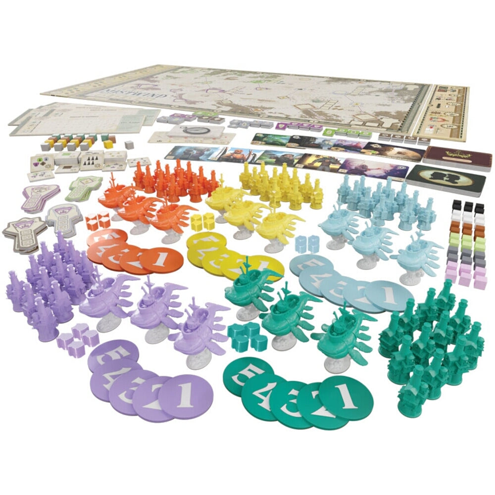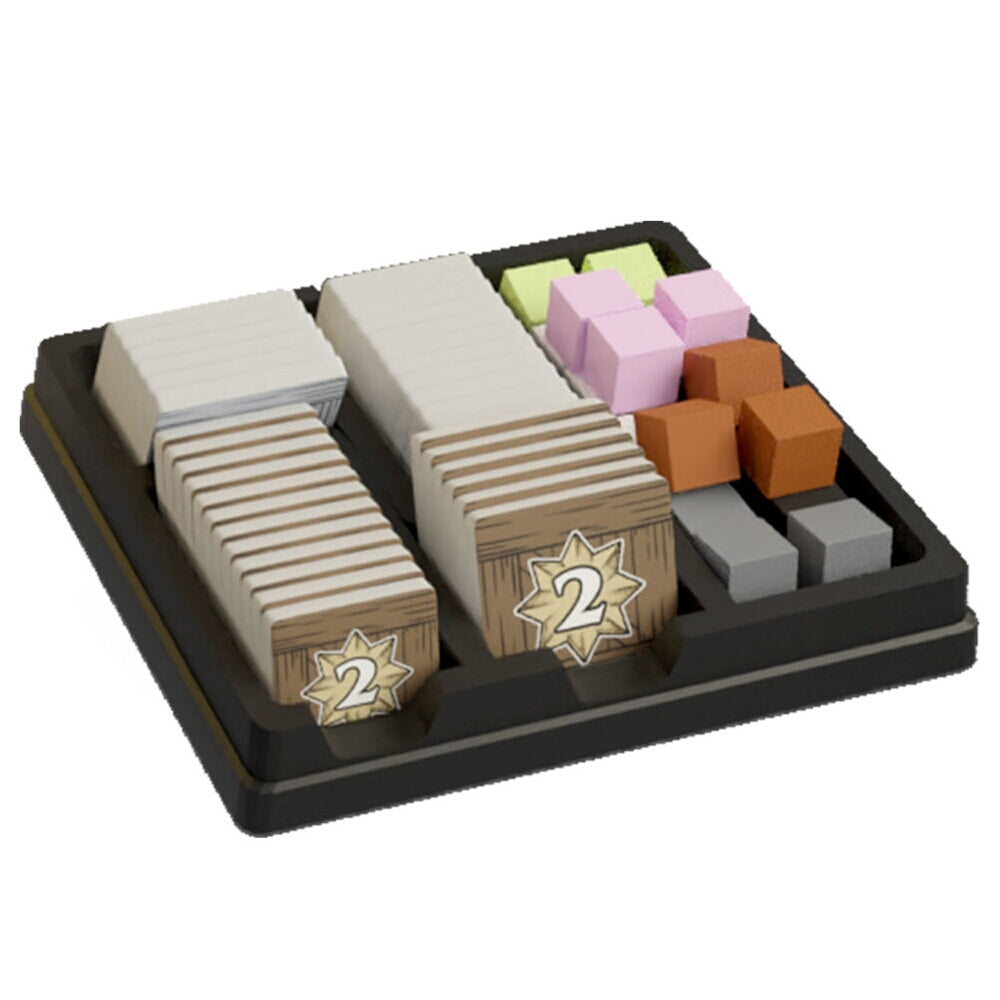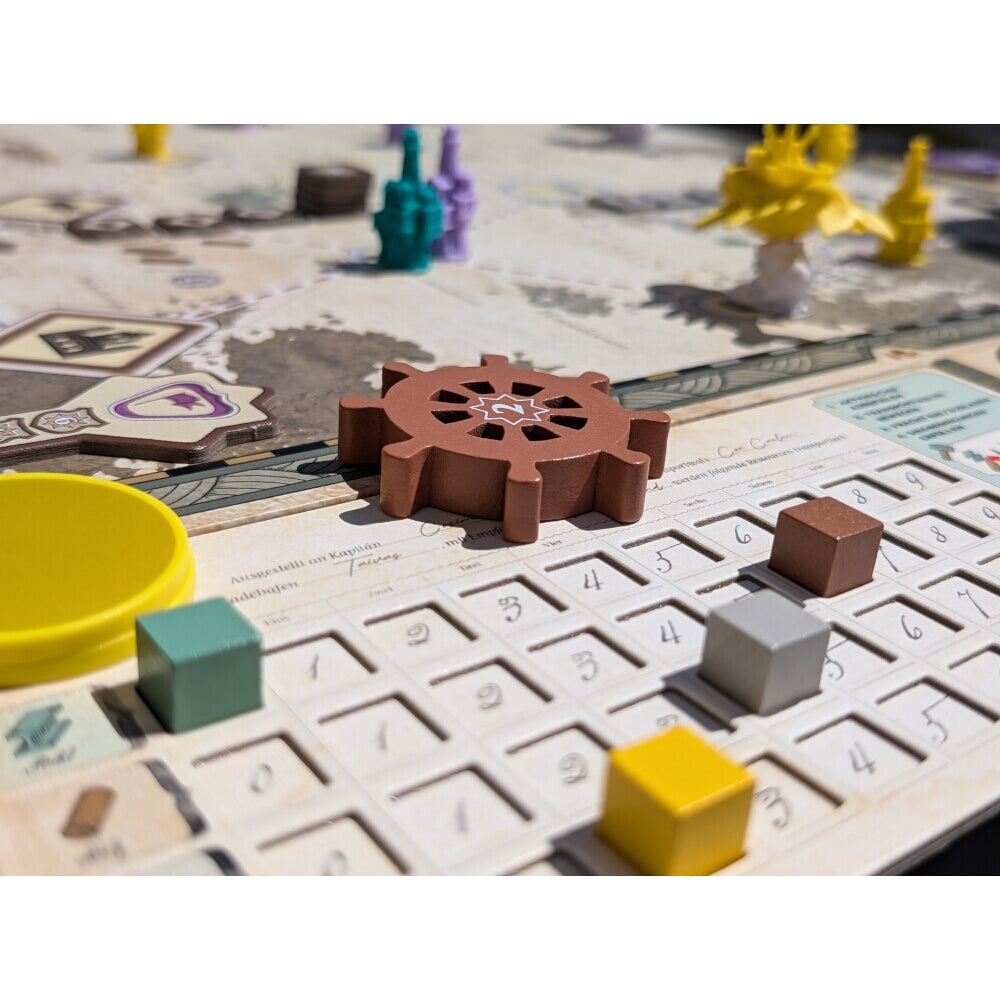 - Inhalt60 Außenposten, 48 Nachfrageplättchen, 36 Charakterkarten, 36 Frachtmarker, 26 Hafenkarten, 25 Aktions-Chips, 24 Erfolgsplättchen, 20 Kontrollmarker, 20 Ressourcenmarker, 15 Netzwerkkarten, 15 Transportwale, 12 Nachfrageplättchen, 12 Netzwerkplättchen, 5 Spielerhilfen, 5 Spielertableaus, 1 Arbeitertableau, 1 Ressourcentableau, 1 Rundenmarker, 1 Spielplan, 1 Startspielermarker