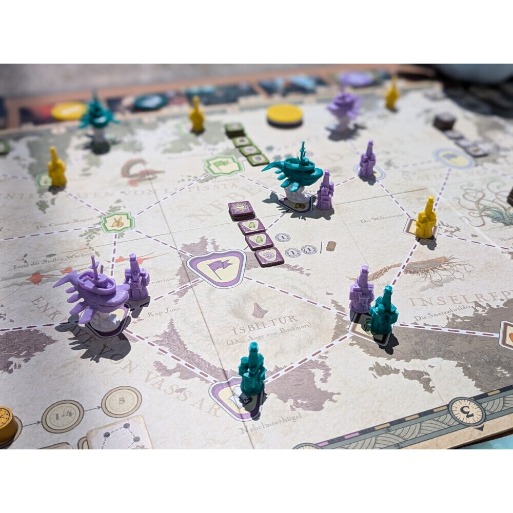 Wir sind Geschäftsführer eines Handelsunternehmens und wollen uns einen Namen in Nebelwind machen. Durch das Ausspielen von Aktions-Chips sammeln wir in jeder Runde Ressourcen, um Außenposten zu bauen oder Transportwale auszubilden, um Fracht zu sammeln und auszuliefern oder Handelsverträge mit benachbarten Nationen abzuschließen. Unser Ziel: die Effizienz unserer Netzwerke zu maximieren und die vertrauenswürdigsten Händler in Nebelwind zu werden. Dabei müssen wir aber immer auch die Nachfrage in unseren Territorien im Blick behalten.