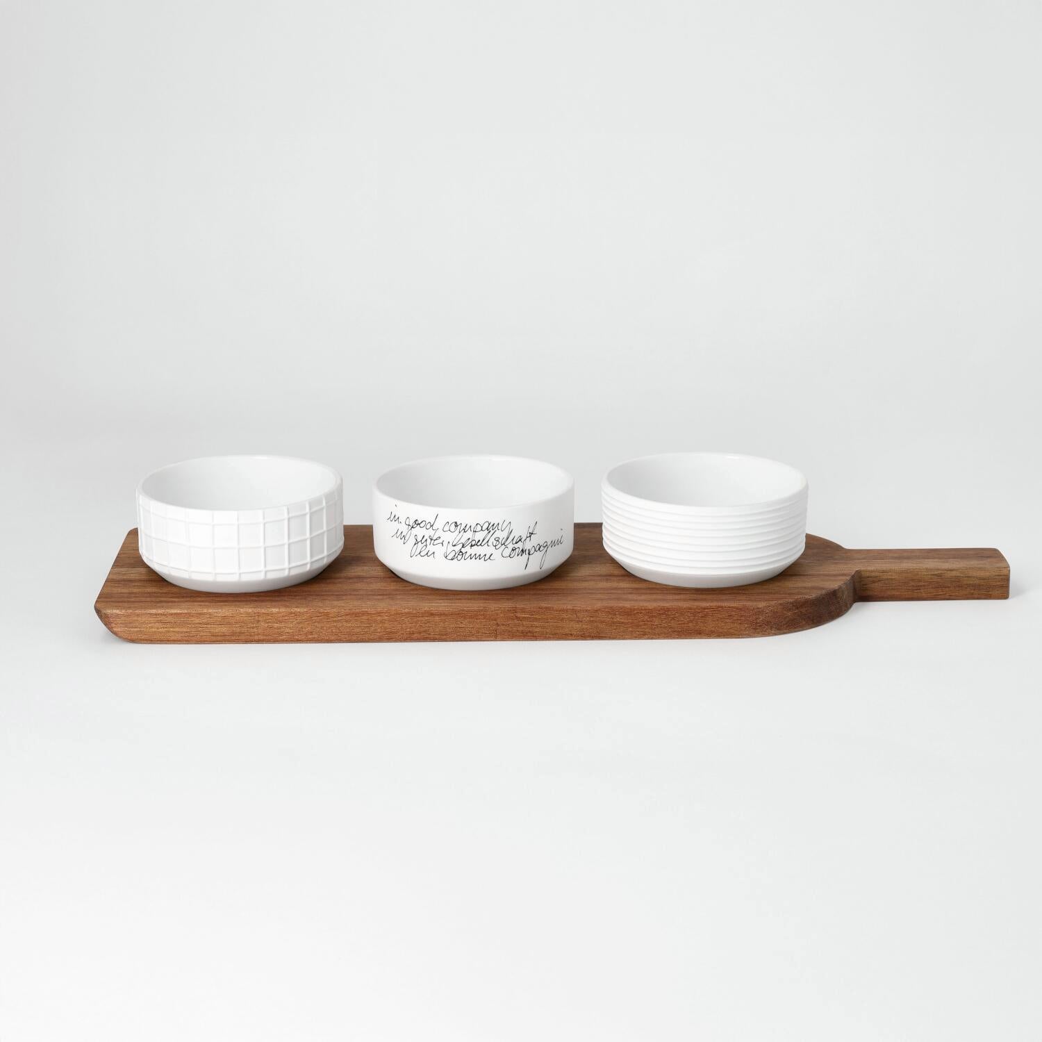 Das Servierbrett mit Schälchen „Häppchenweise“ von räder Design ist ein stilvolles Set für Genussmomente. Ob für kleine Häppchen, Dips, Oliven oder andere Leckereien – dieses Ensemble kombiniert hochwertiges Holz mit edlem Porzellan und sorgt so für eine praktische und zugleich dekorative Präsentation.