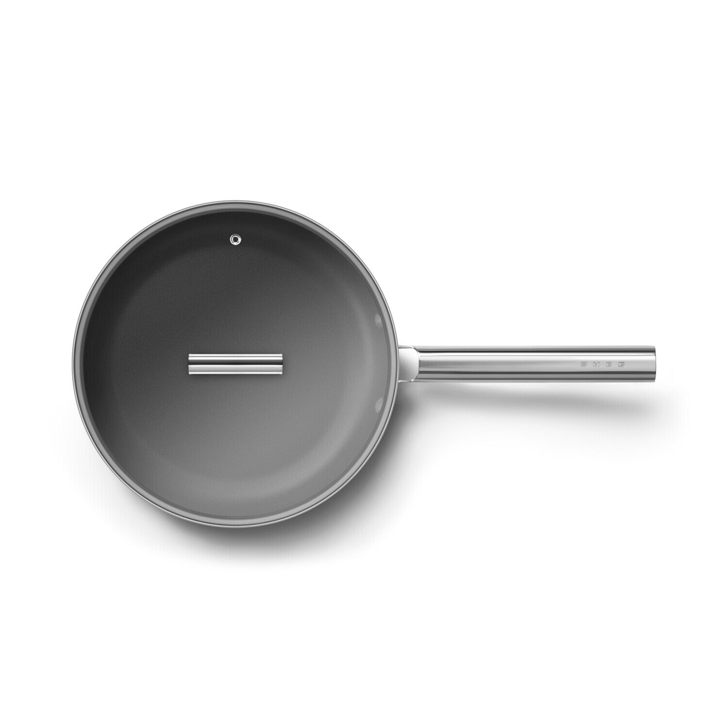 Die smeg Pfanne besteht aus kaltgeschmiedetem Aluminium auf Stahlbasis, das für das Induktionskochen geeignet ist.