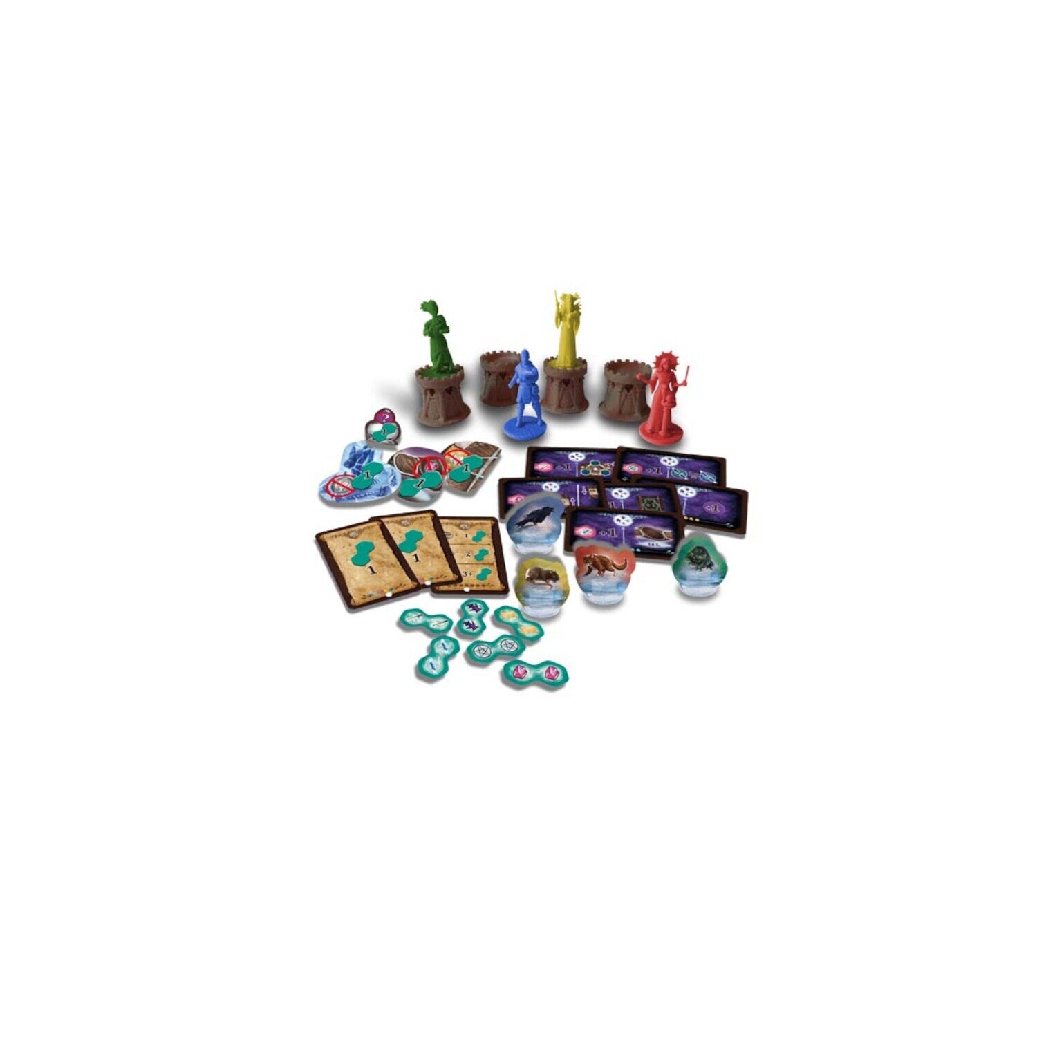 1 Spielplan, 4 Zauberkessel, 60 Hexplättchen, 15 Sonderhexplättchen, 10 Eulenplättchen, 44 kleine Hexenfiguren, 4 große Hexenfiguren, 80 Energieeinheiten, 28 Kristalle, 40 Karten (Pergamente), 21 Magiechips, 12 Zähler, 4 Sichtschirme, 4 Positionsmarker, 1 Spielerhilfe, 6 Aktionsmarker, 1 Anleitung + 4 Türme, 4 Hexen bzw. Zaubererminiaturen, 9 Karten, 6 Hexplättchen, 1 Regelheft