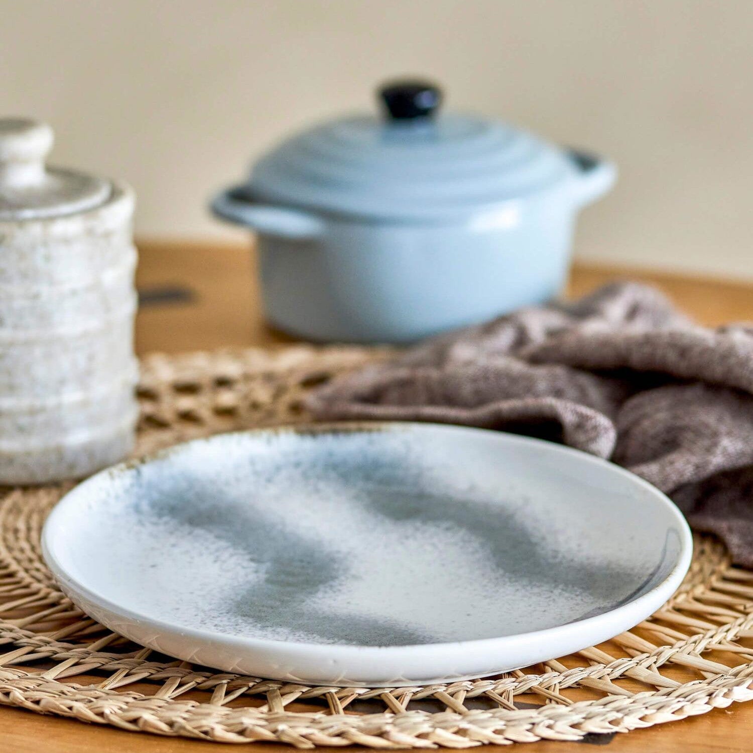 Dieser runde Teller ist in einer harmonischen Mischung aus wellenförmigen Streifen in Grau und Weiß glasiert, die ein einzigartiges Design erzeugen. Mit seiner Größe von 20 cm ist er ideal für sowohl Frühstück als auch Mittagessen oder Snacks.