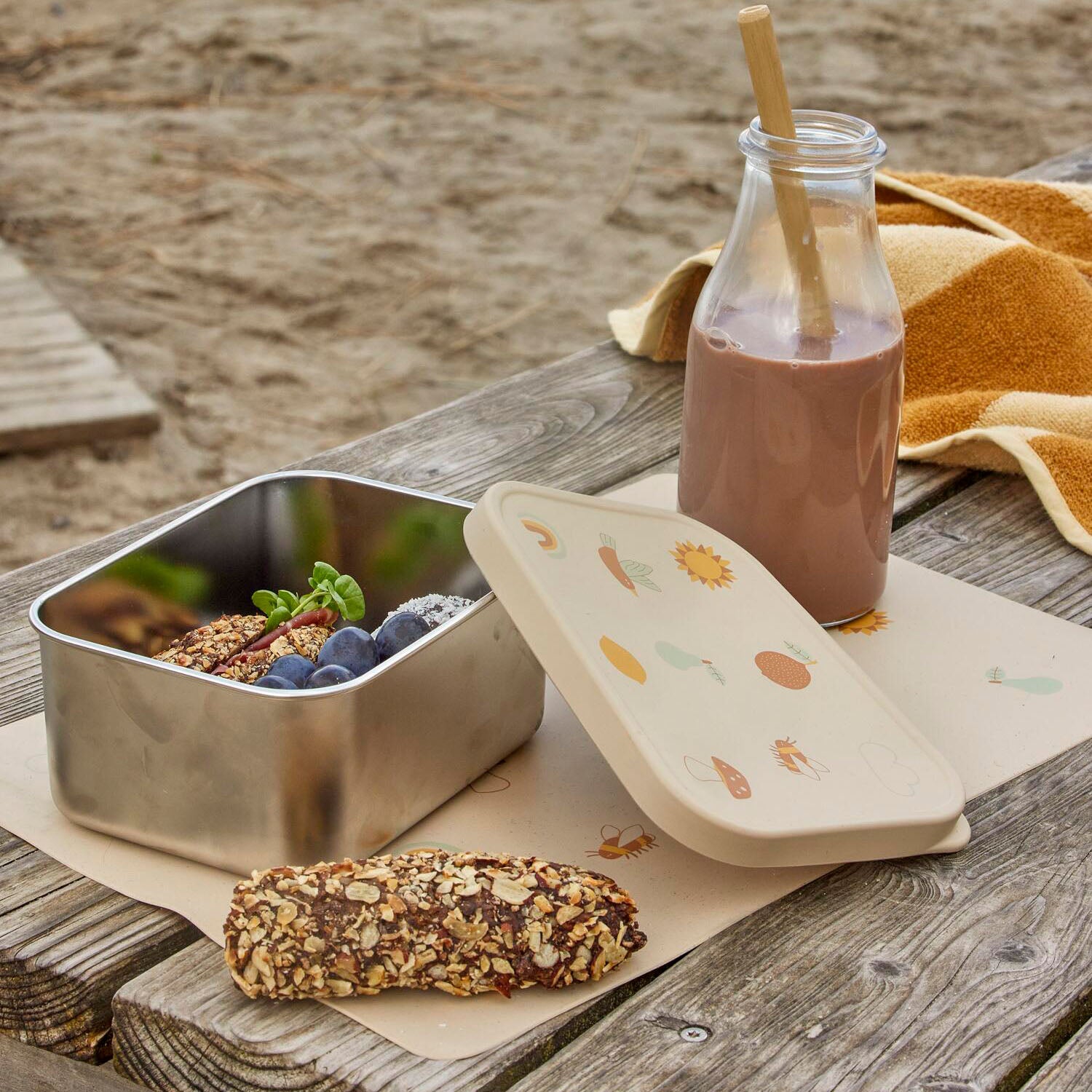 Die "Agnes" Platzdecke von Bloomingville MINI bringt ein beruhigendes Design in sanften Naturtönen auf den Tisch und sorgt für eine angenehme Atmosphäre während der Mahlzeiten. Die rutschfeste Silikon-Oberfläche hält Teller und Besteck sicher an Ort und Stelle, ideal für alle kleinen Hände.