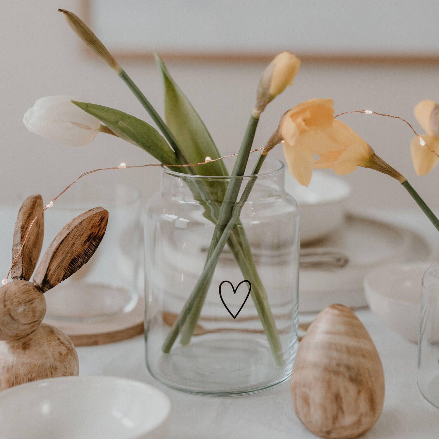Die Vase aus Glas "Herz" von Eulenschnitt bringt zarte Romantik in jeden Raum. Ihr klares Design mit dem dezenten Herz-Motiv setzt Blumen und Trockensträuße stilsicher in Szene und schafft eine warme, einladende Atmosphäre.