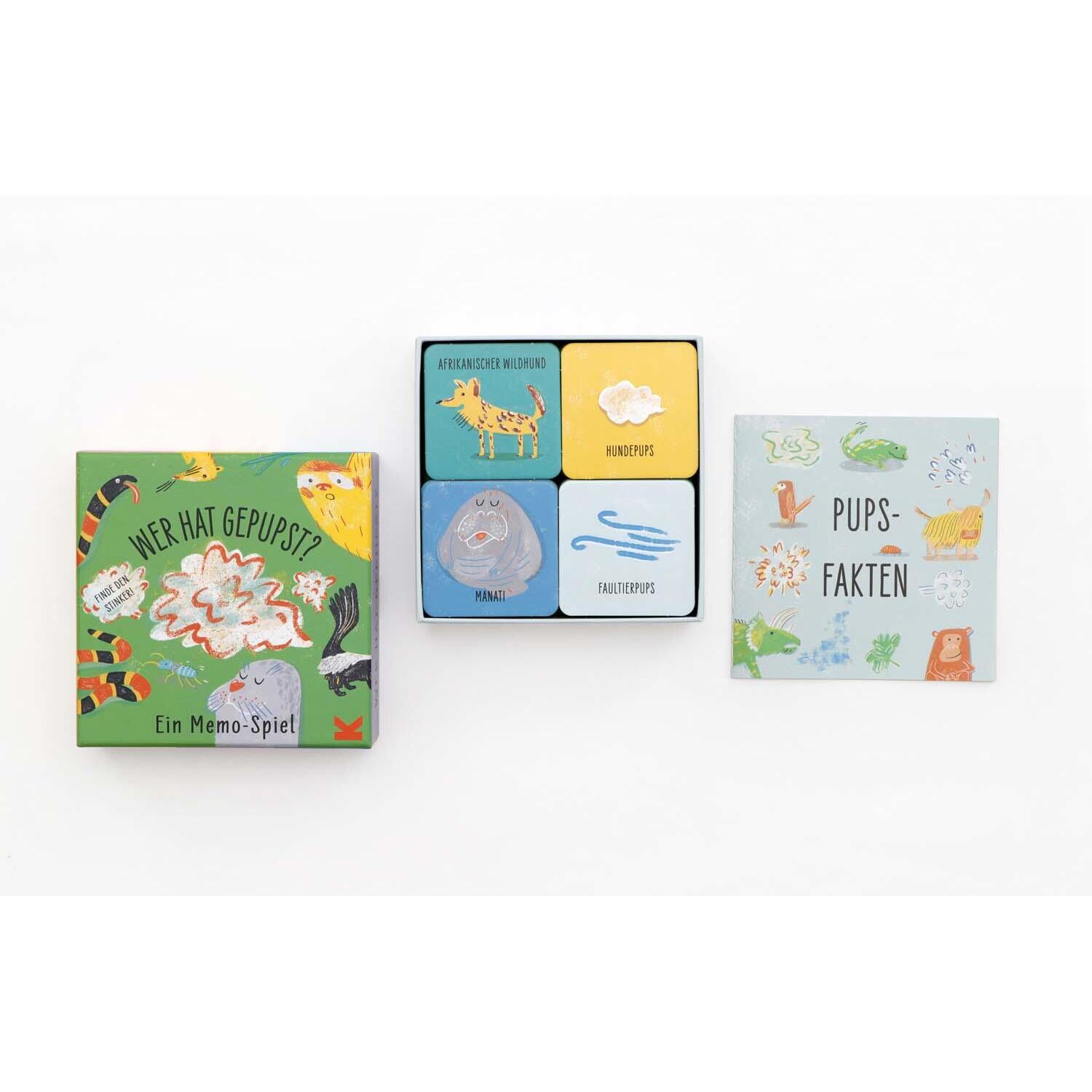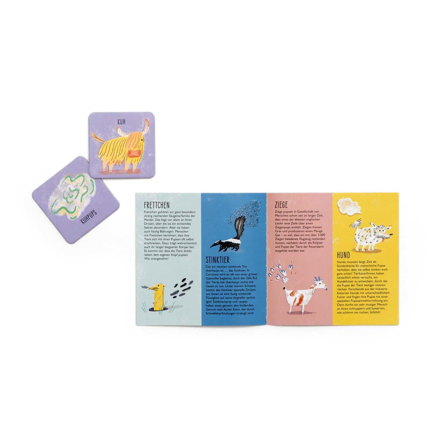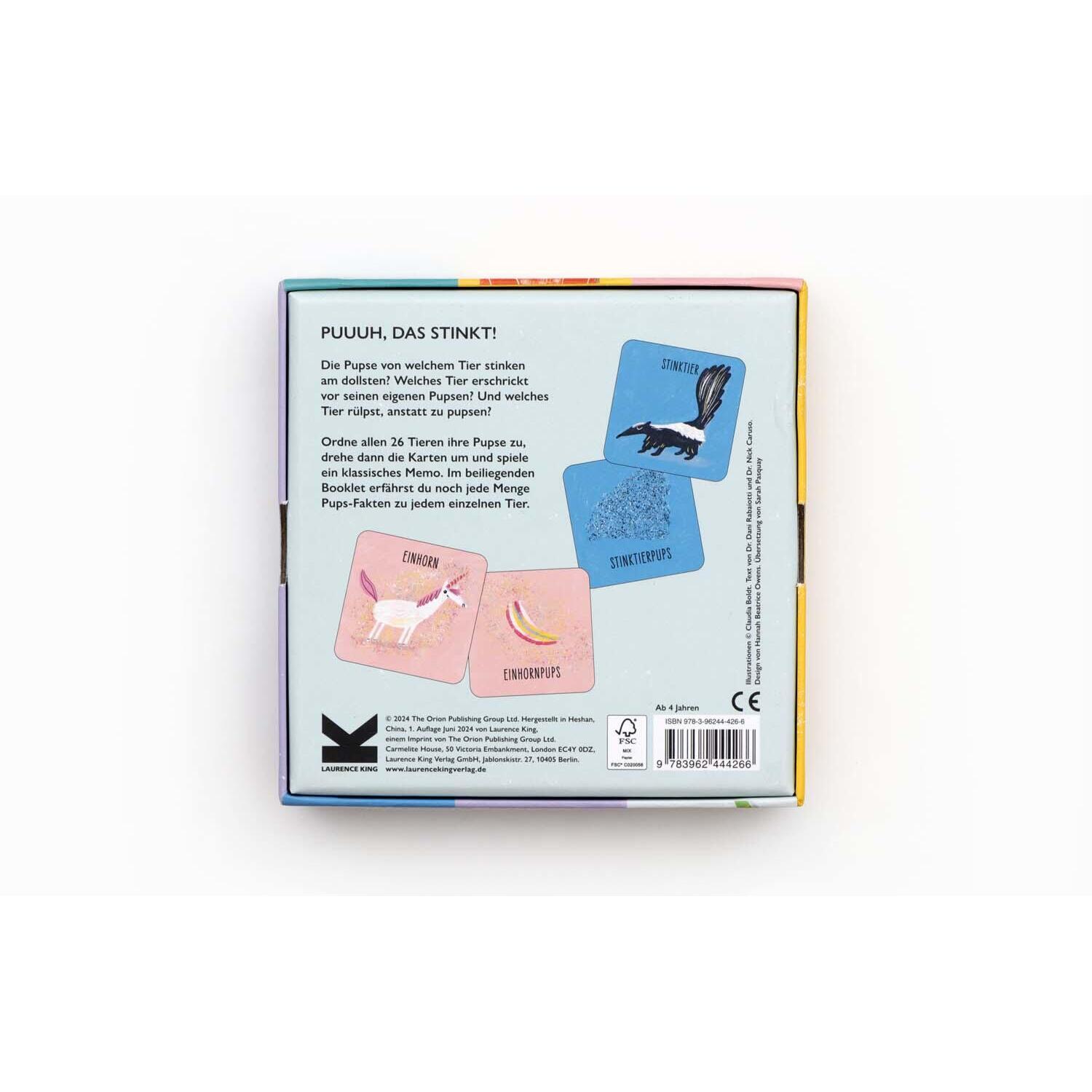 Puuuh, das stinkt! Aber die Pupse von welchem Tier stinken am dollsten? Welches Tier erschrickt vor seinen eigenen Pupsen? Und welches Tier rülpst, anstatt zu pupsen? In diesem Memo ordnet ihr allen 26 Tieren ihre jeweiligen Pupse zu. Wer die meisten passenden Pärchen findet, gewinnt! Im beiliegenden Booklet erfahrt ihr außerdem jede Menge über die Pupse der einzelnen Tiere. Ein lustiges Memo für Groß und Klein!