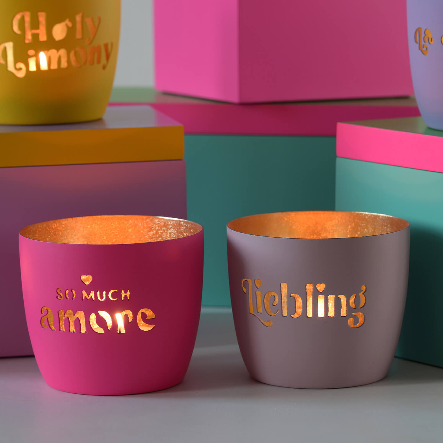 - Madras, Windlicht, M, Motiv: Küsschen, hot pink/gold Eisen hot pink/gold H8,5cm, D10cm