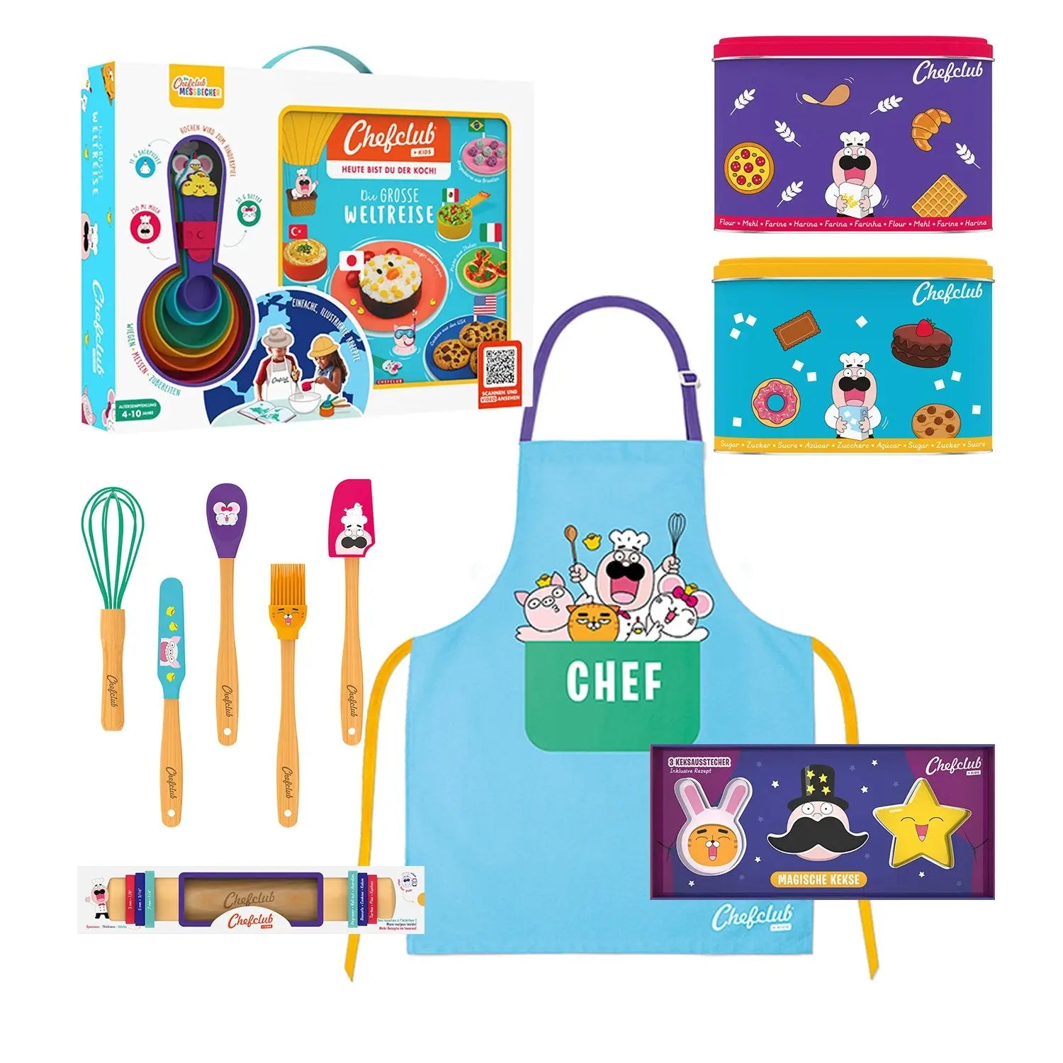 - MaterialSchürze: 100% Baumwolle (Bio) | Utensilien & Nudelholz: Bambus, Silikon | Ausstecher & Dosen: Metall | Messbecher: Kunststoff | Kochbuch: Papier