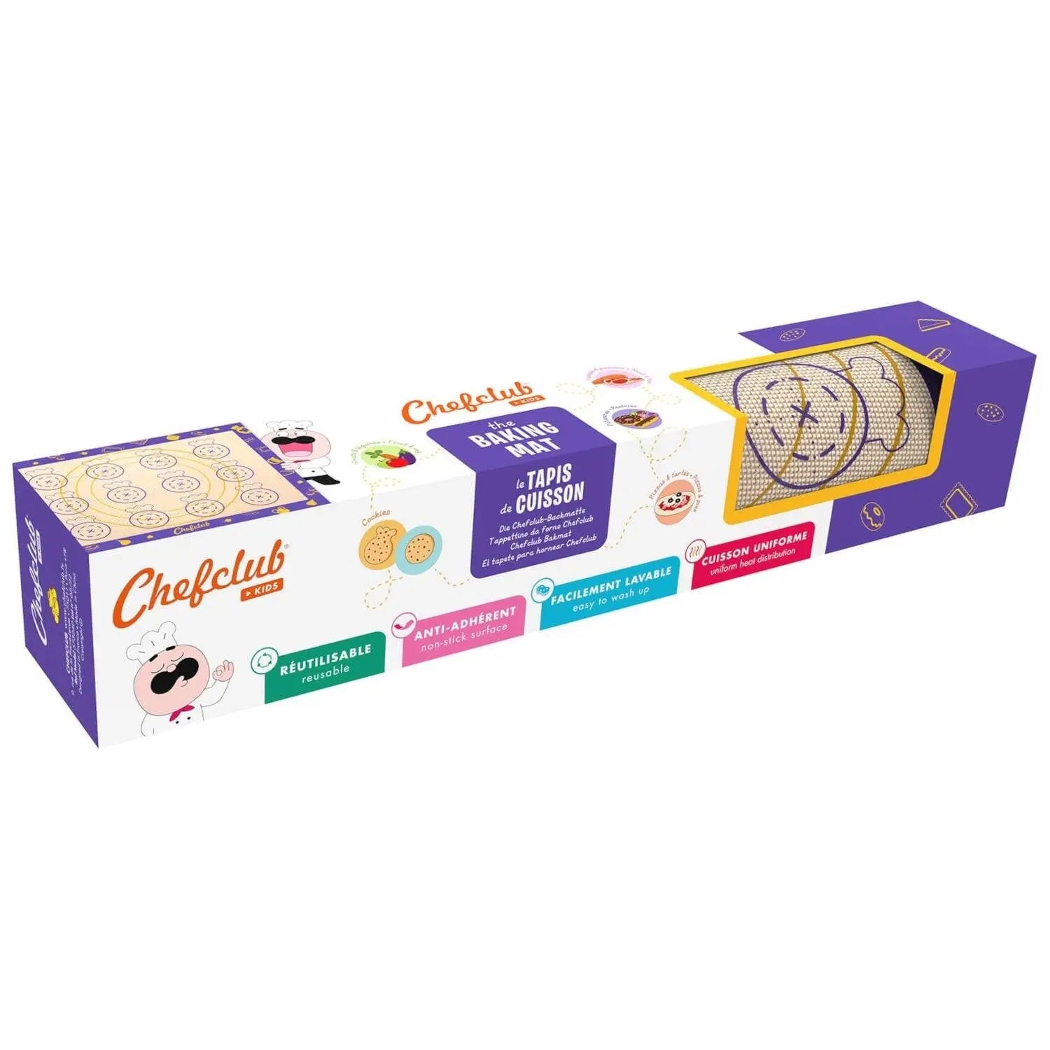 Die Chefclub Backmatte ersetzt das Backpapier. Mit Antihaft-Eigenschaften, leicht zu reiningen und wiederverwendbar, wird auch die Hitze gleichmäßig weitergeleitet, für ein uniformes Backergebnis. Dank Grafiken und Hilfslinien können süße und herzhafte Rezepte in gleichen Formen gebacken werden. Ein Cookie-Rezept für die Backmatte ist im Lieferumfang enthalten.