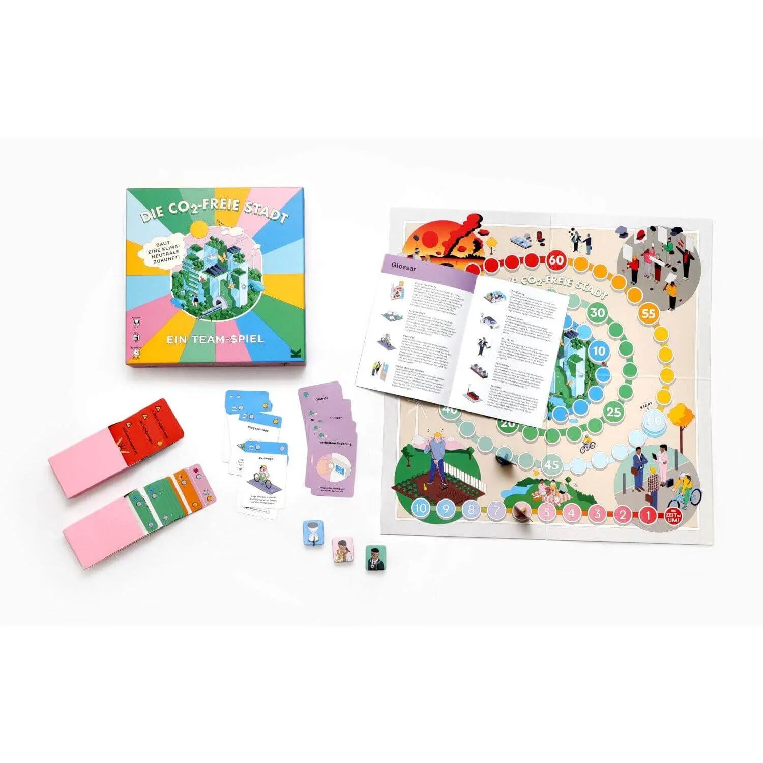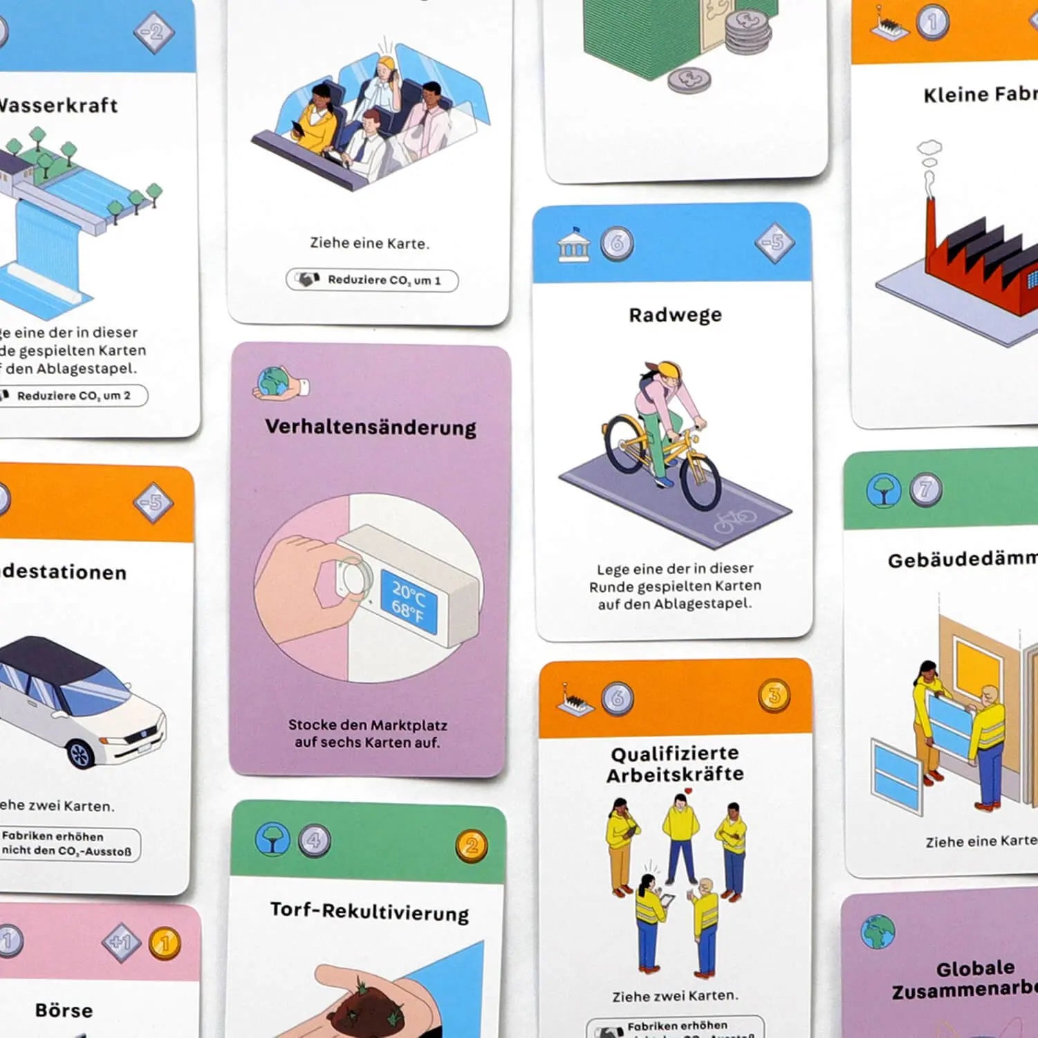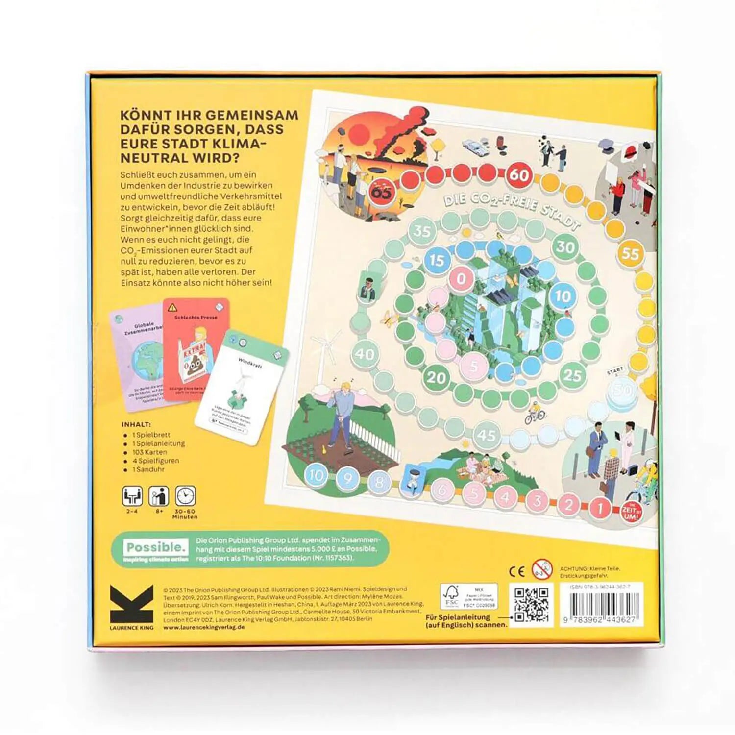 Es ist an der Zeit, sich zusammenzuschließen und gemeinsam an einer klimaneutralen Stadt zu arbeiten - wir sitzen alle im selben Boot, also werden wir alle gewinnen oder alle verlieren! Dies ist ein kooperatives Klimaschutz-Spiel. De Spielenden eine bauen eine nachhaltige Stadt auf, indem sie den Verkehr umweltfreundlicher gestalten, die Industrie umstellen, die Einwohner*innen mit an Bord holen und der Politik zeigen, wie es geht. Jede*r beginnt mit einem identischen Deck und kauft zusätzliche Karten von einem gemeinsamen Marktplatz, um eine klimafreundliche Stadt zu schaffen. Die Notwendigkeit, Einkommen zu generieren und gleichzeitig den CO2-Ausstoß zu reduzieren, muss ausbalanciert werden, aber es führen zahlreiche Wege zum Ziel. Ausschlaggebend bei allen Aktionen ist die Zusammenarbeit! Es müssen Regierungen, Unternehmen und die Öffentlichkeit an einen Tisch gebracht werden. Wenn es nicht gelingt, den CO2-Ausstoß auf null zu senken, bevor es zu spät ist, haben alle verloren. Es könnte also nicht mehr auf dem Spiel stehen...