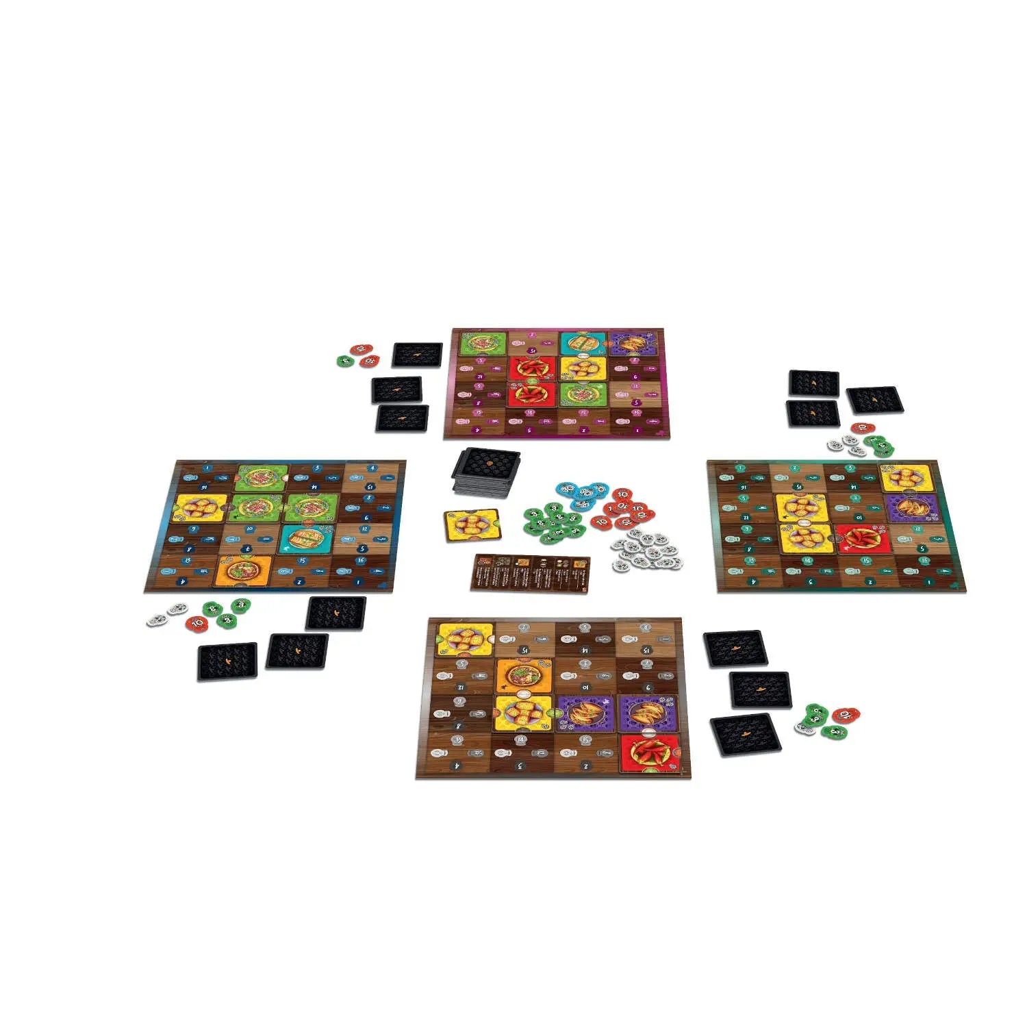 Isabella und Miguel feiern ein großes Familienfest zu Ehren der Toten und ihr wollt ihnen helfen. Doch die vielen Gäste und verschiedenen Gerichte fordern euch ganz schön heraus! Jeder von euch ist für einen Tisch zuständig und versucht, die Wünsche der Gäste zu erfüllen. Reihum bietet ihr für die Speisen - doch aufgepasst: Die freien Zahlen auf euren Tischen bestimmen gleichzeitig eure Gebote und die Plätze, auf die ihr die Gerichte legen könnt! Wer leer ausgeht, darf seinen Tisch um 90° drehen - und bekommt so wieder neue Zahlen zum Bieten! Das Familienspiel "Fiesta Mexicana" vereinbart einen spannenden Biet- und Drehmechanismus zu einem gelungenen Spielspaß ink. mexikanischen Leckereien. Wem gelingt es, mit seinen Gerichten am besten zu punkten?