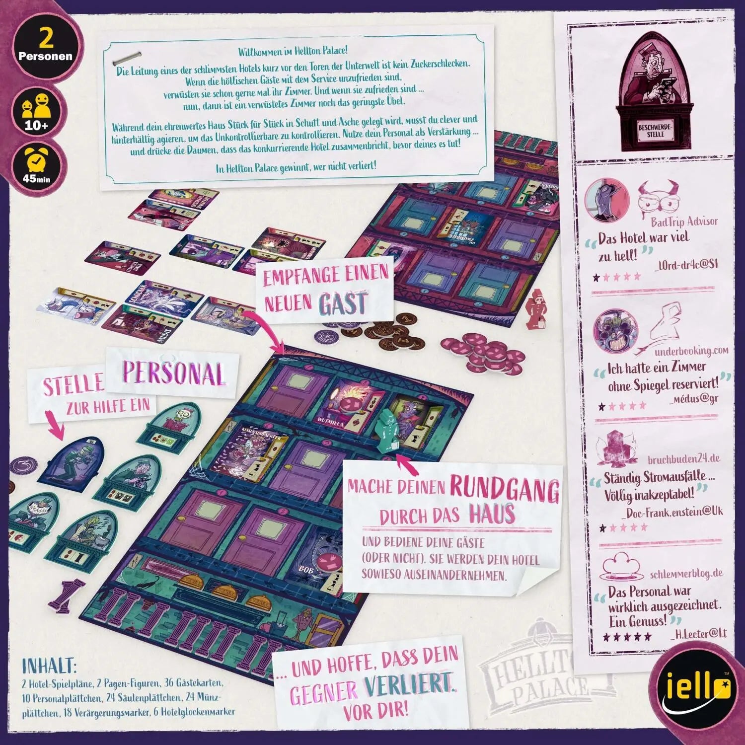 Willkommen im Hellton Palace! Die Leitung eines der schlimmsten Hotels kurz vor den Toren der Unterwelt ist kein Zuckerschlecken. Wenn die höllischen Gäste mit dem Service unzufrieden sind, verwüsten sie schon gerne mal ihr Zimmer. Und wenn sie zufrieden sind ... nun , dann ist ein verwüstetes Zimmer noch das geringste Übel. Während dein ehrenwertes Haus S tück für Stück in Schutt und Asche gelegt wird, musst du clever und hinterhältig agieren, um das Unkontrollierbare zu kontrollieren. Nutze dein Personal als Verstärkung ... und drücke die Daumen, dass das konkurrierende Hotel zusammenbricht, bevor deines es tut! In Hellton Palace gewinnt, wer nicht verliert!