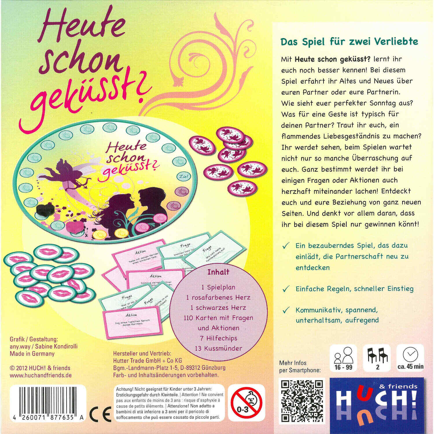 Mit Heute schon geküsst? lernen sich Frischverliebte und Langvermählte noch besser kennen und erfahren Neues über den Partner oder die Partnerin. Viele Fragen und Aktionen laden zum Knutschen und Busseln ein. Wie sieht beispielsweise der perfekte Sonntag aus? Bei diesem Spiel gewinnen im Zwei - nur Küssen ist schöner!