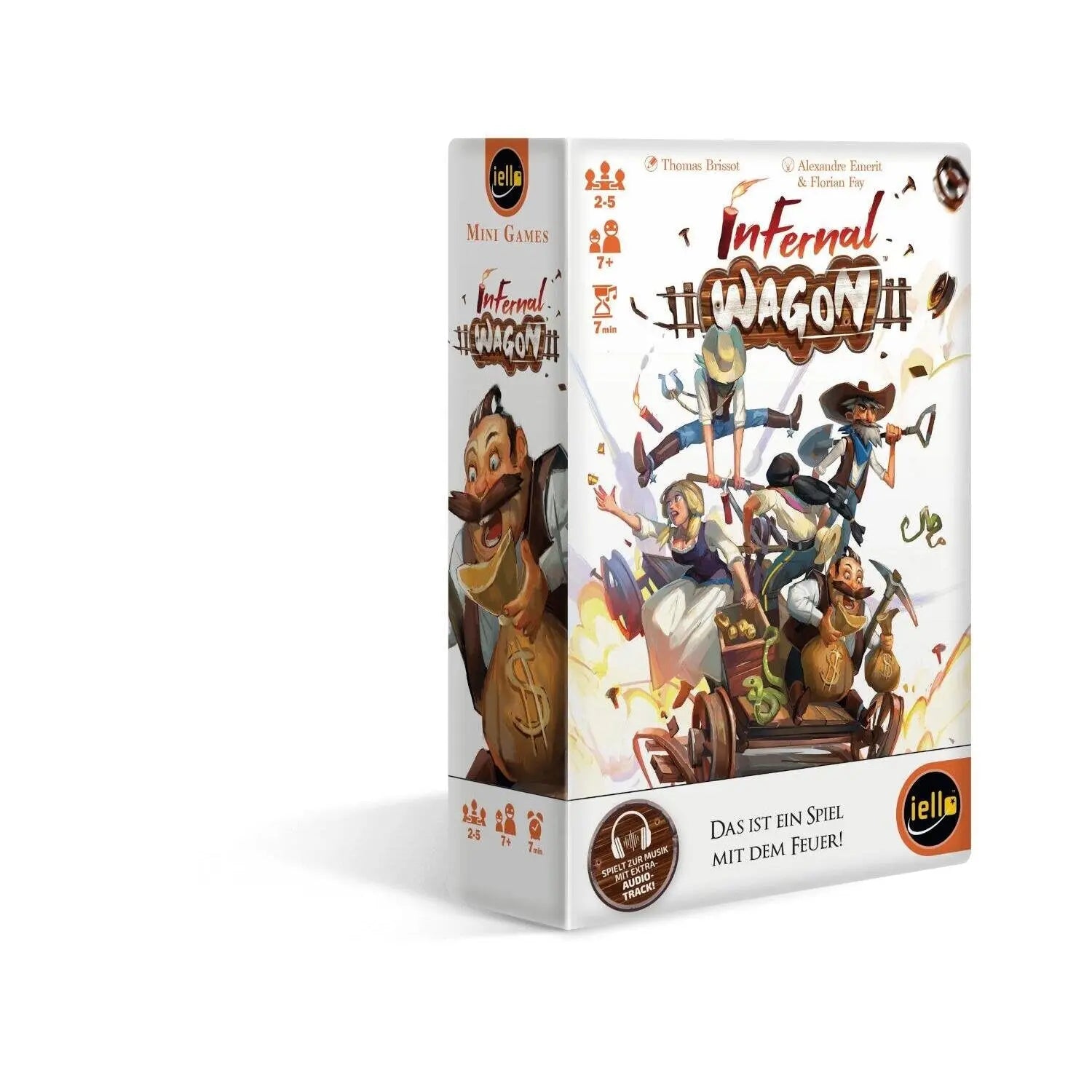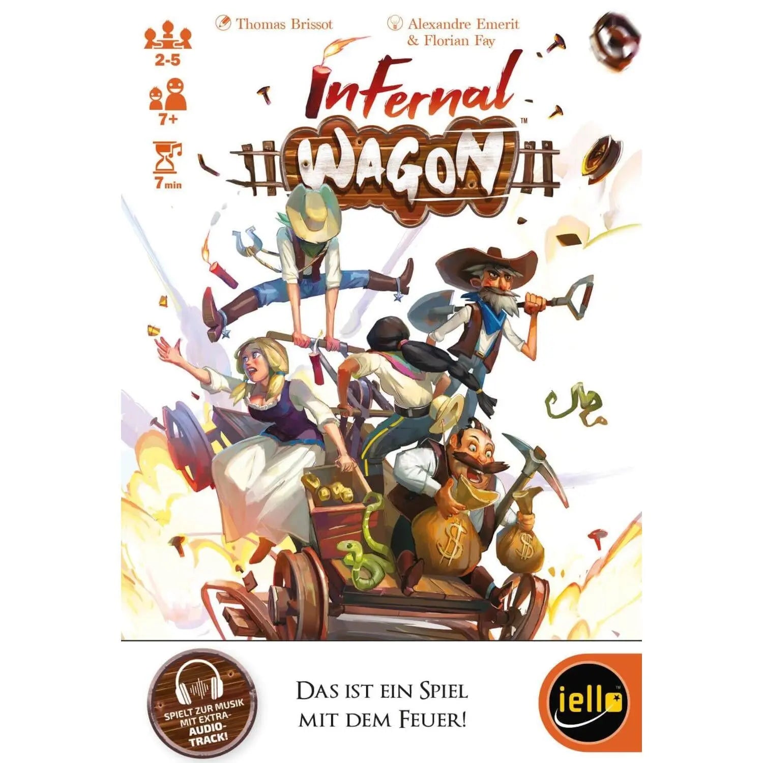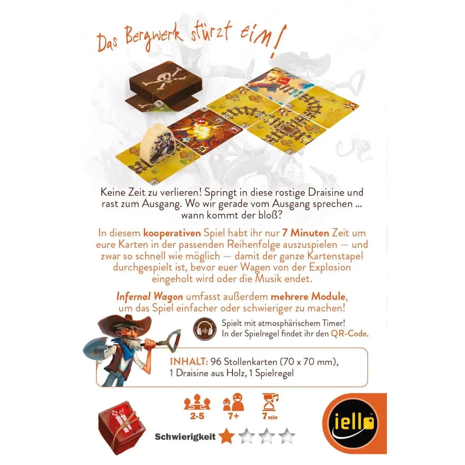 ENTKOMME AUS DER MINE, BEVOR SIE EXPLODIERT! Oh nein, das Bergwerk stürzt ein! Beeil dich, spring in den Wagon und rase zum Ausgang! Infernal Wagon ist ein lustiges kooperatives Spiel, bei dem die Spieler zusammenarbeiten müssen, um einen Weg zum Ausgang zu finden... bevor die Zeit abläuft! Aber Vorsicht: Jede ausgespielte Karte kann verheerende Effekte auslösen!