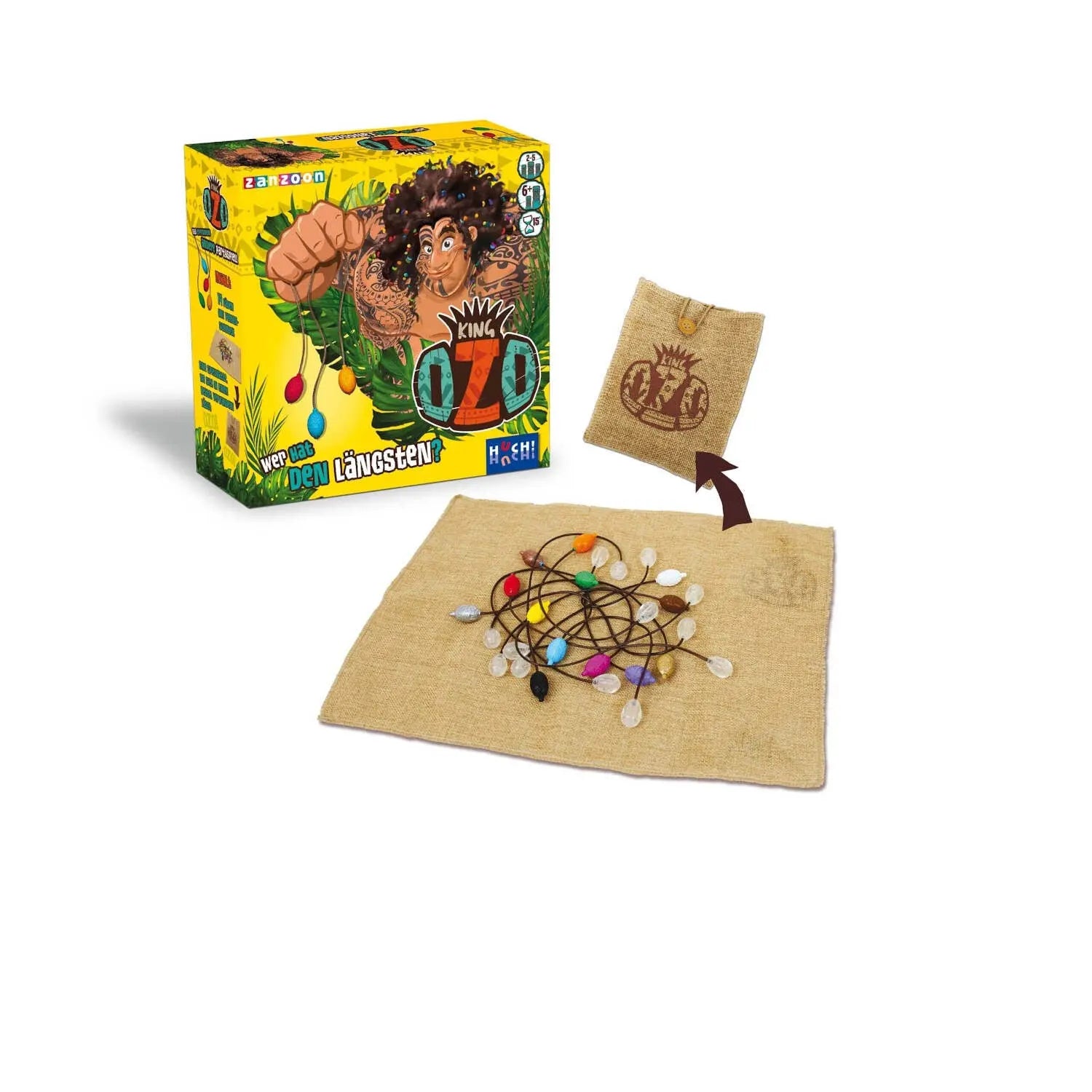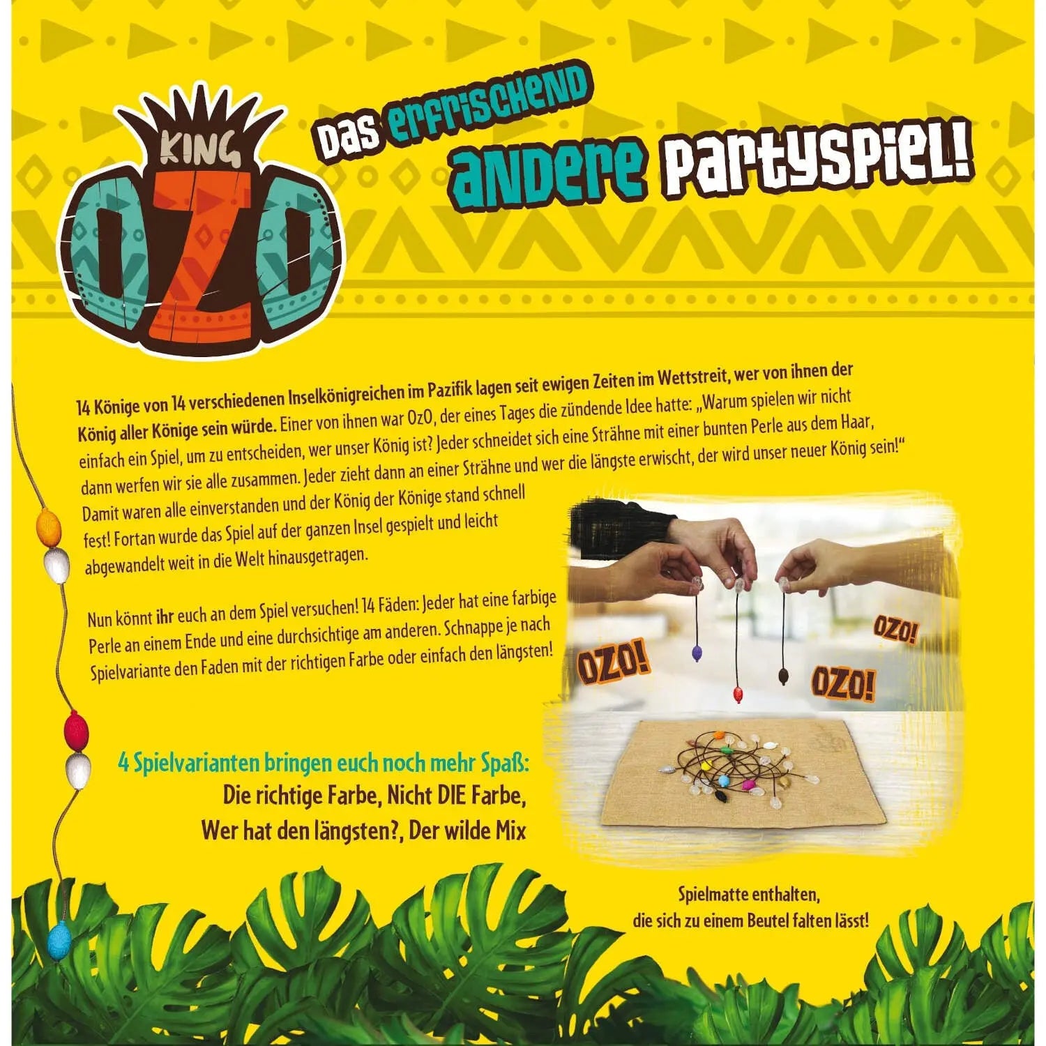 14 Fäden: Jeder hat eine farbige Perle an einem Ende und eine durchsichtige am anderen. Schnappe je nach Spielvariante den Faden mit der richtigen Farbe oder einfach den längsten! King OzO, das erfrischend andere Partyspiel!