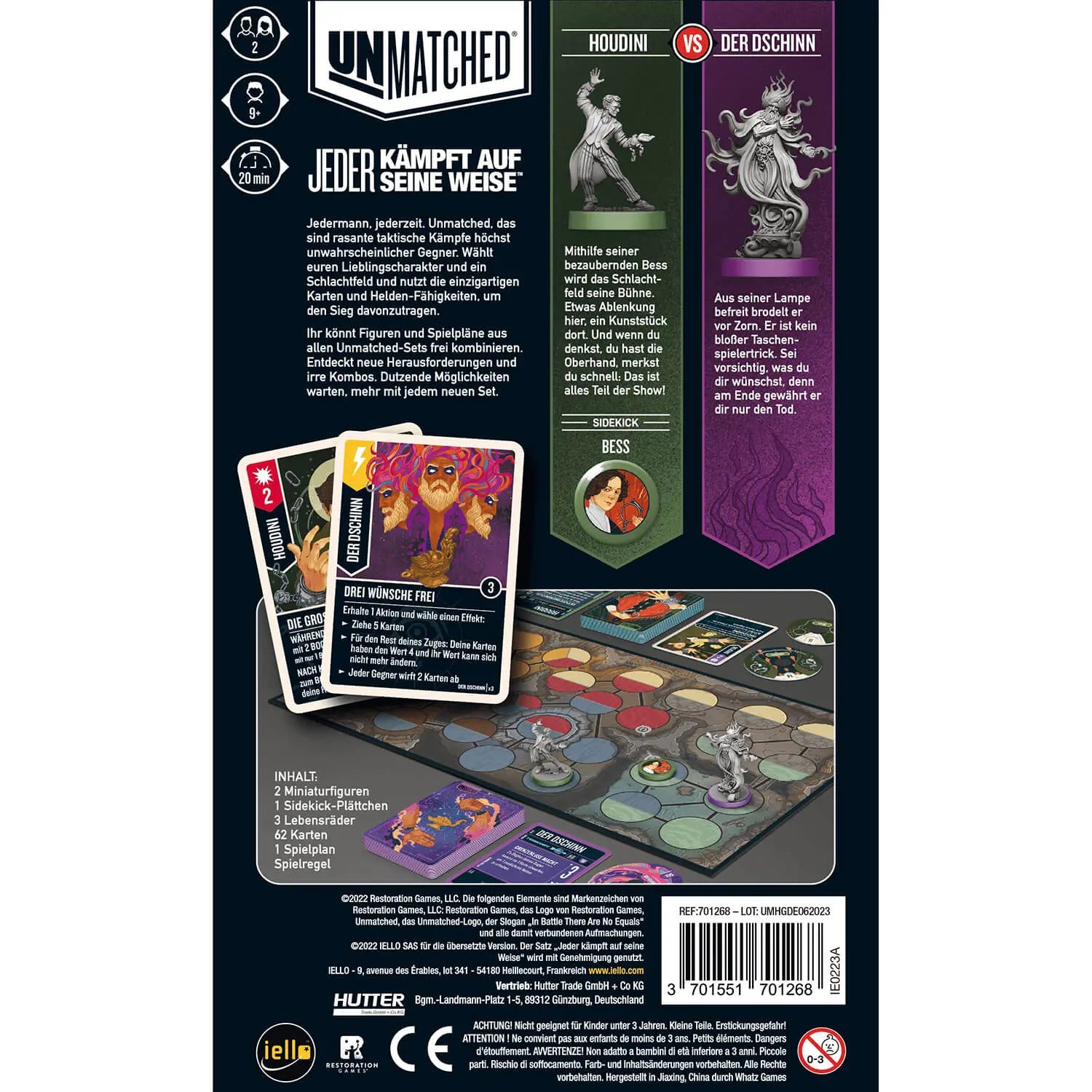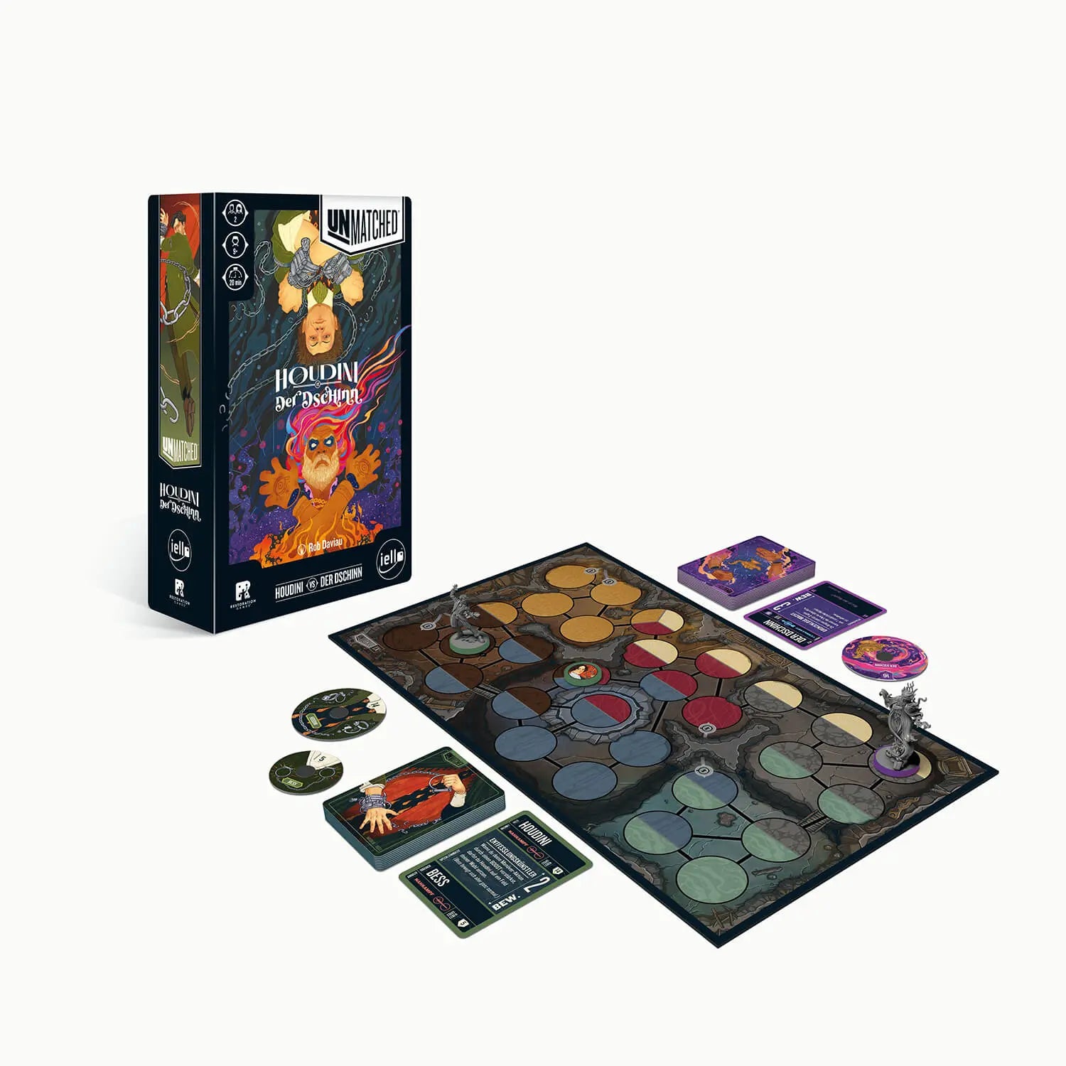 Houdini ist vielleicht der größte Illusionist aller Zeiten und ein neuer Held im Unmatched-Universum. Mit wem hast du es wirklich zu tun, mit einem grimmigen Magier oder seinem reizenden Gehilfen? the Genie ist ein sehr beweglicher und weitreichender Charakter. Auch wenn er keinen Handlanger hat, kann er sich auf seine Lampe verlassen, um seine Gegner in eine unendliche Geschichte zu verwickeln
