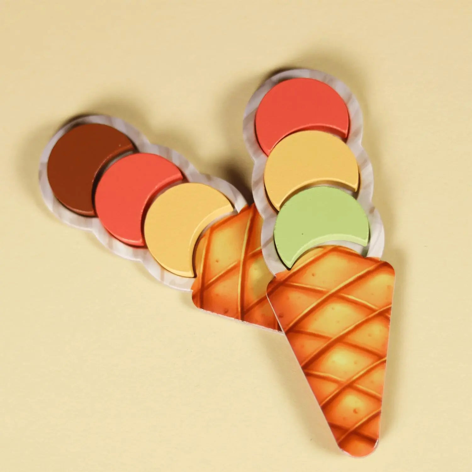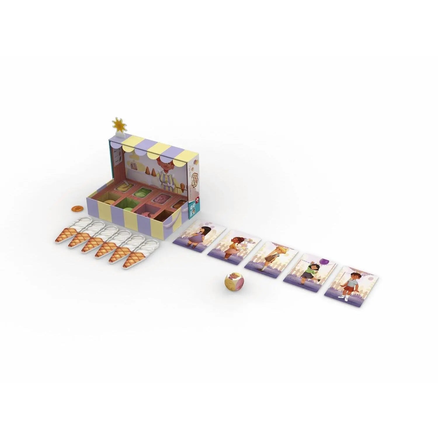 - Inhalt1 Eisstand in zwei Teilen, 5 Kinderkarten, 24 Eiskugeln, 6 Eistüten, 1 Bestellwürfel, 1 Sonne, 1 Münze, 1 Anleitung
